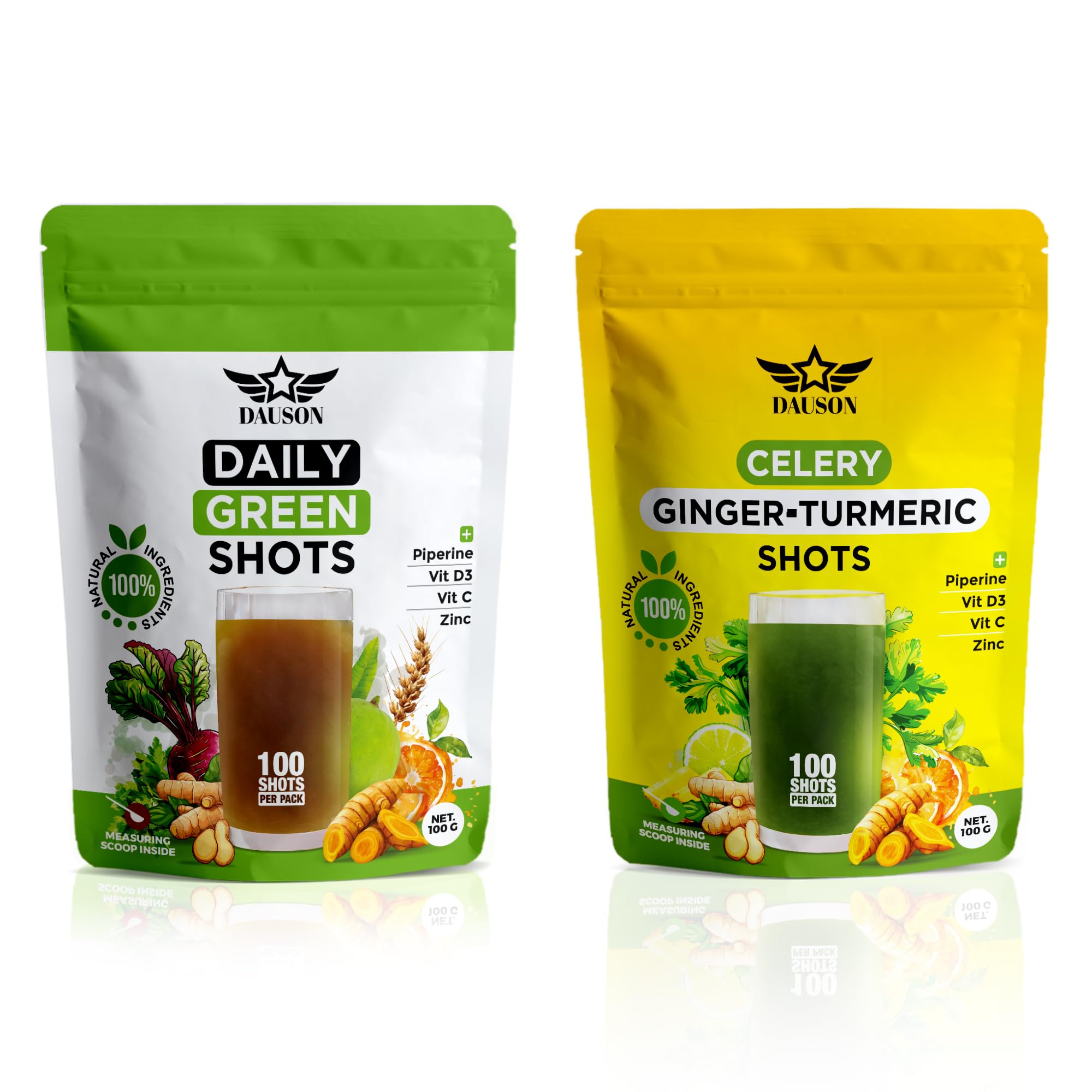 Daily Green & Ginger Turmeric Shots 100 Servings Superfood Blend with Wheatgrass Matcha Beetroot Ashwagandha Celery Inulin Lemon Pineapple Vitamin C D3 & Zinc | Vegan Wellness Drink Powde