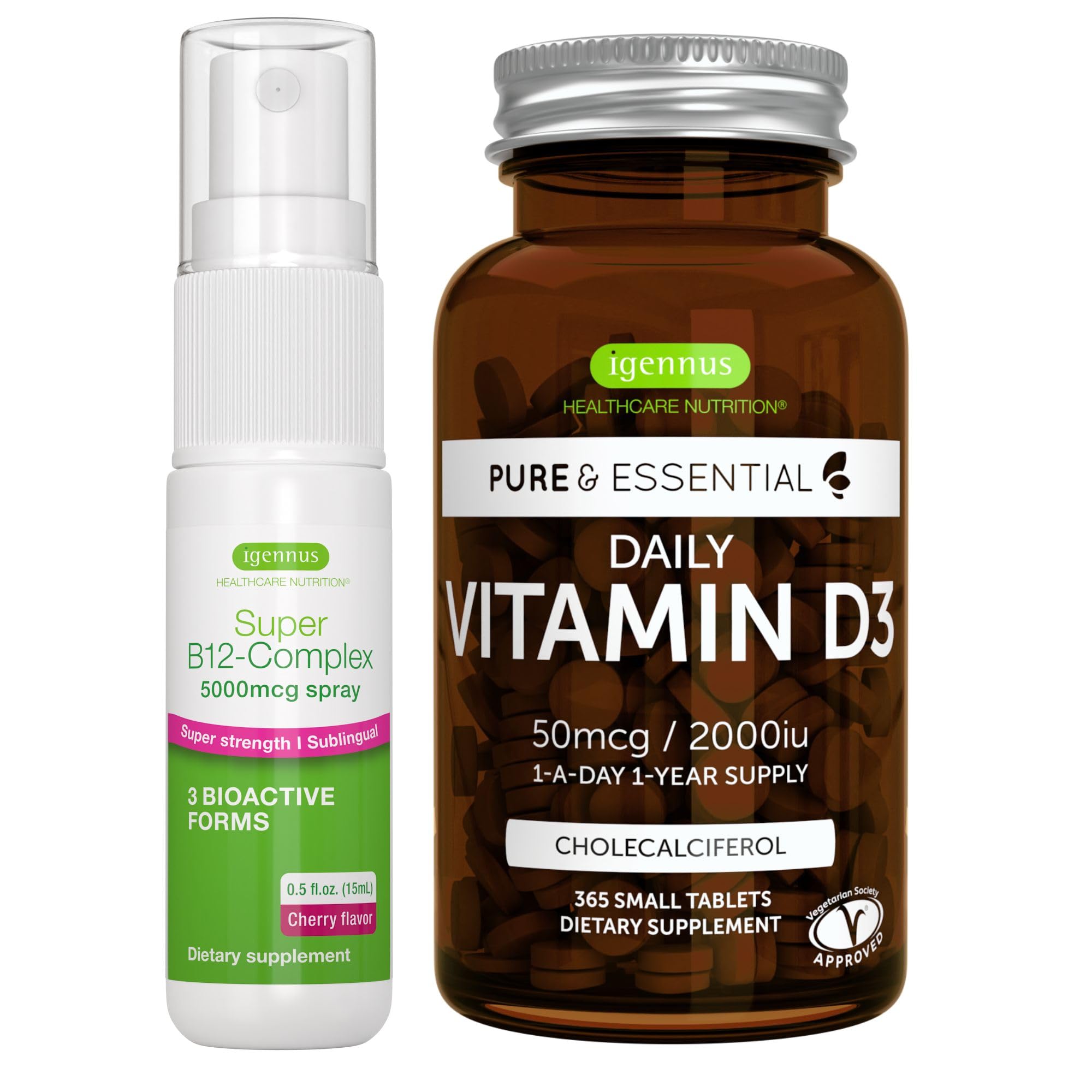 Daily Vitamin D3 + Super B12-Complex 5000mcg Vegetarian Bundle 365 2000iu Vitamin D3 Tablets + High Strength B12 Cherry Flavor Sublingual Spray by Igennus