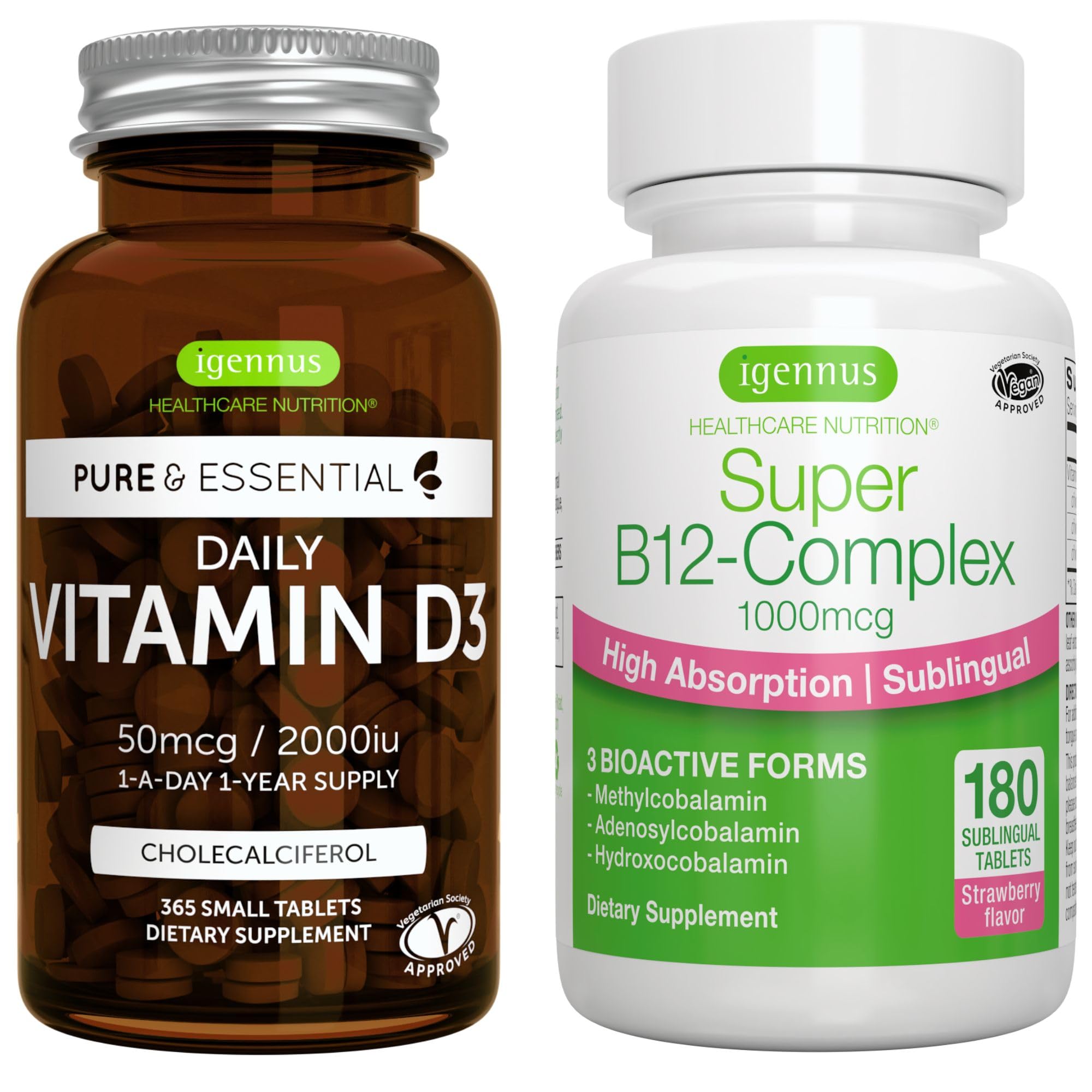 Daily Vitamin D3 + Super B12-Complex Vegetarian Bundle 365 2000iu Vitamin D3 Tablets + High Absorption Sublingual B12 by Igennus