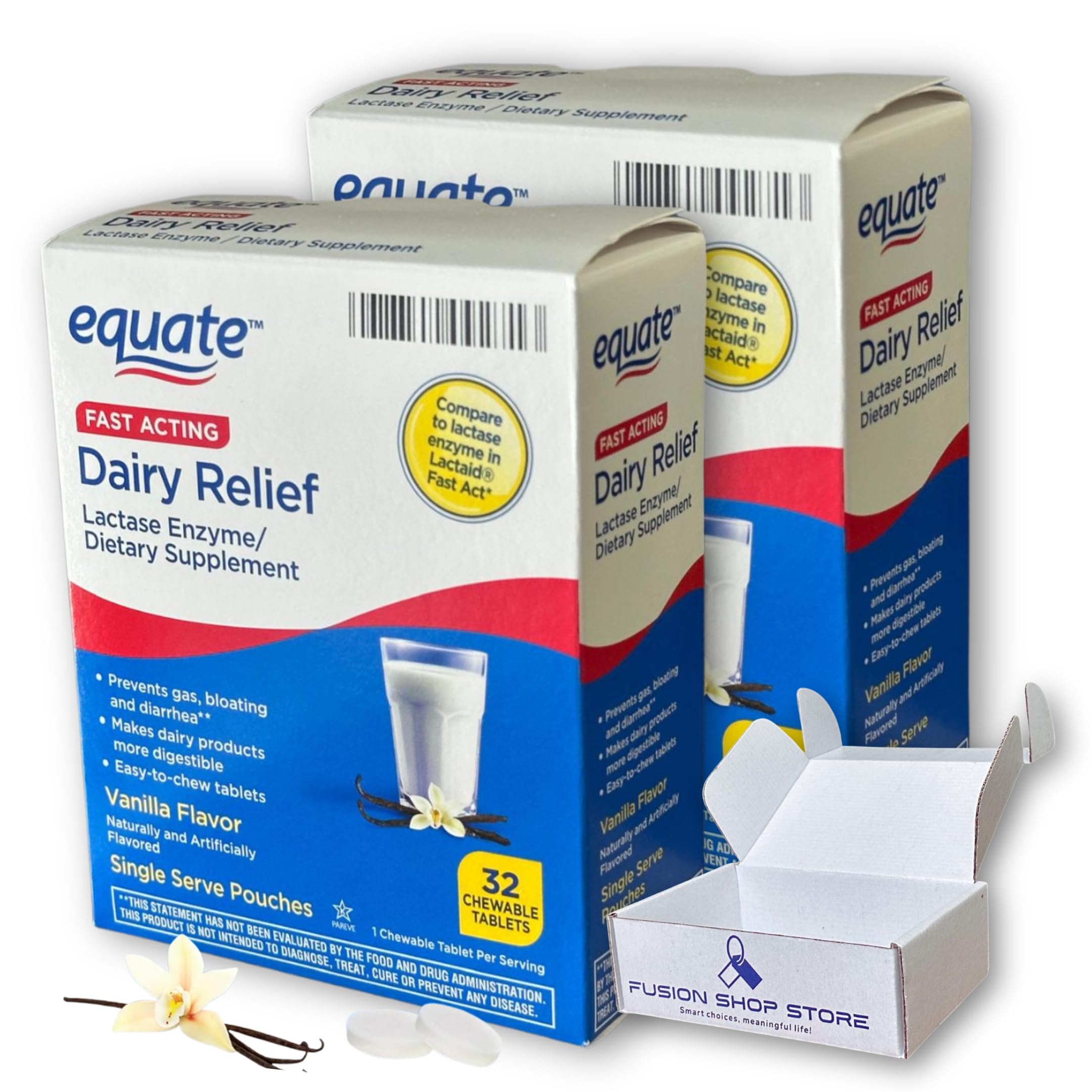 Dairy Pills for Lactose Intolerance- Fast Acting Relief Vanilla Flavor 32 chewable Tablets Lactaid Chewables Lactase Enzyme (Pack of 2) Boxed by Fusion Shop Store