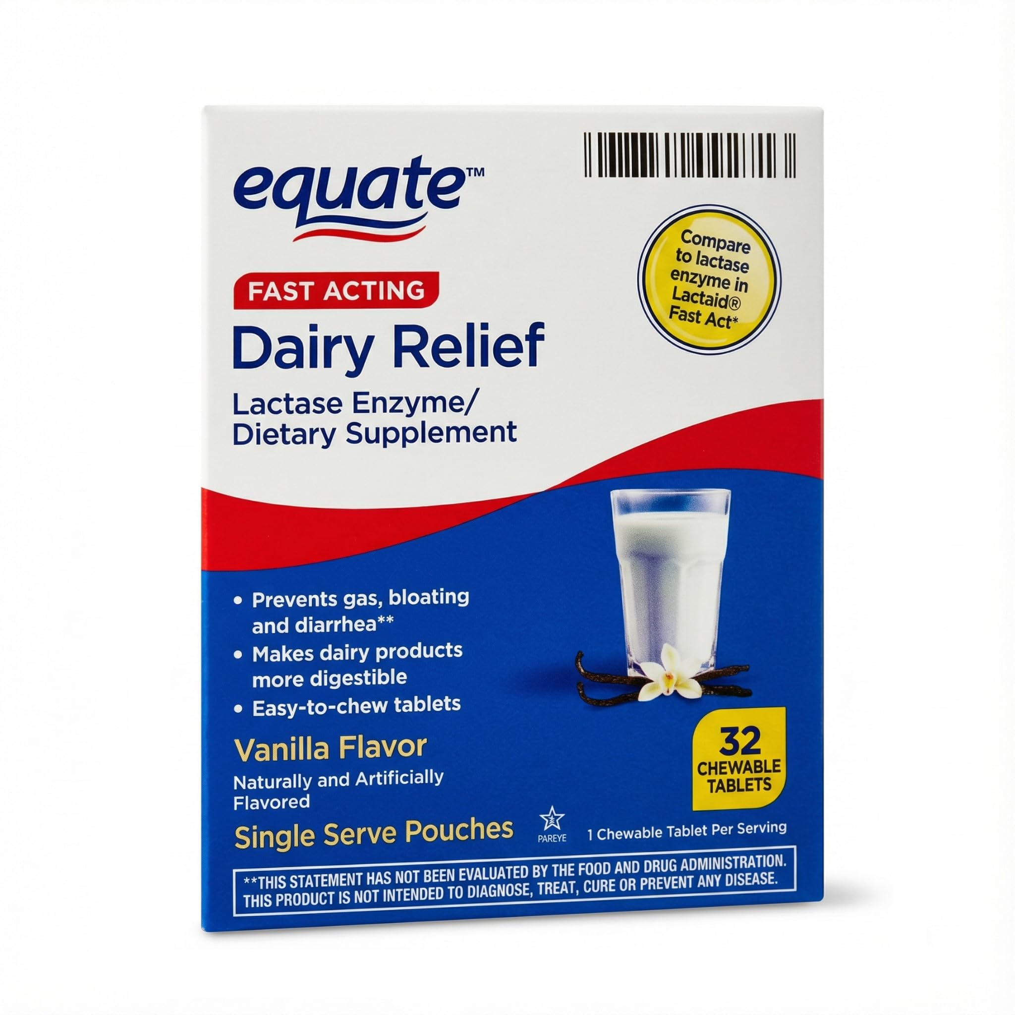 Dairy Relief Lactase Enzyme Chewable Tablets – 32 Count These dairy relief chewable tablets are formulated with lactase enzyme to support the digestion of dairy products that contain lactose. Designed for adults who regularly consume milk, cheese, ice cream, or other dairy foods, this supplement helps make dairy easier to digest when taken with meals. Each chewable tablet provides lactase enzyme activity commonly found in dairy digestive supplements. This formula is often searched as lactase enzyme tablets, lactose pills, dairy relief pills, or dairy digestive enzymes, offering a practical option for everyday dairy consumption. Lactase Enzyme Support: Contains lactase enzyme used to help improve the digestibility of dairy products. 9000 FCC Enzyme Activity: Lactase enzyme strength commonly used in lactose digestion supplements. Chewable Tablets: Easy-to-chew format with a smooth vanilla flavor. Dairy Digestive Enzymes: Designed for adults who include dairy in their daily diet. Convenient Packaging: Includes 32 chewable tablets individually wrapped in single-serve packets. This dairy relief supplement is suitable for those searching for lactose pills for adults, lactase chewable tablets, dairy enzyme supplements, or lactose digestion support. The individually packaged tablets make it easy to carry and use at home, work, restaurants, or while traveling. Common search terms associated with this product include lactase enzyme supplements, dairy digestive supplement, lactose tablets, dairy pills, milky lactase pills, and dairy enzymes for digestion. With a chewable design and portable packaging, this product fits easily into a daily routine for those who consume dairy products.On-the-Go Single Serve Packs – Includes 32 chewable tablets individually packaged, ideal for travel, dining out, or daily use when consuming dairy products. Vanilla Flavor Chewables – Easy-to-chew tablets with a smooth vanilla flavor, offering a convenient alternative to swallowing capsules or pills. Dairy Digestion Support – Designed for adults who consume dairy and look for lactose pills, dairy relief tablets, or lactase enzyme supplements to include with meals. 9000 FCC Lactase Enzyme Strength – Each chewable tablet contains lactase enzyme activity commonly used in dairy relief supplements and lactose digestion support products. Lactase Enzyme Chewable Tablets – Formulated with lactase enzyme to support the digestion of dairy products, making it easier to enjoy foods containing lactose as part of a balanced diet.