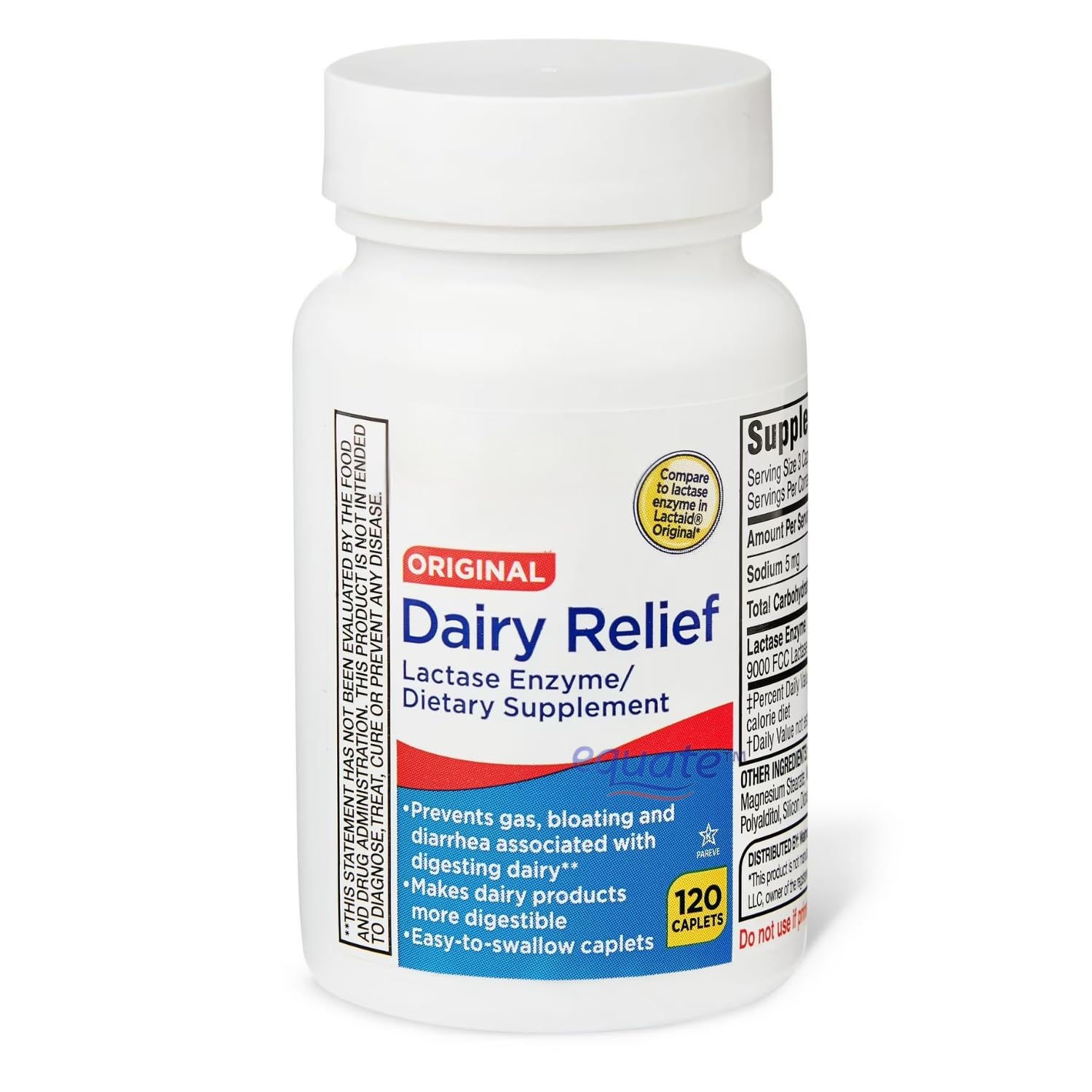 Dairy Relief Caplets deliver a reliable dose of lactase enzyme (9000 FCC) to help individuals with lactose sensitivity enjoy dairy foods again. Each easy-to-swallow caplet is designed to support digestion of lactose in milk, cheese, ice cream, and other dairy products. Taken before consuming dairy, Dairy Relief can help reduce common digestive discomforts such as gas, bloating, and digestive upset. Convenience meets effectiveness with this 120-count bottle — ideal for regular dietary use. Suggested Use: Take one (1) caplet with first bite of each dairy-containing meal or as directed by a healthcare professional. Storage: Store at room temperature, away from moisture and direct sunlight. Disclaimer: These statements have not been evaluated by the Food and Drug Administration. This product is not intended to diagnose, treat, cure, or prevent any disease.