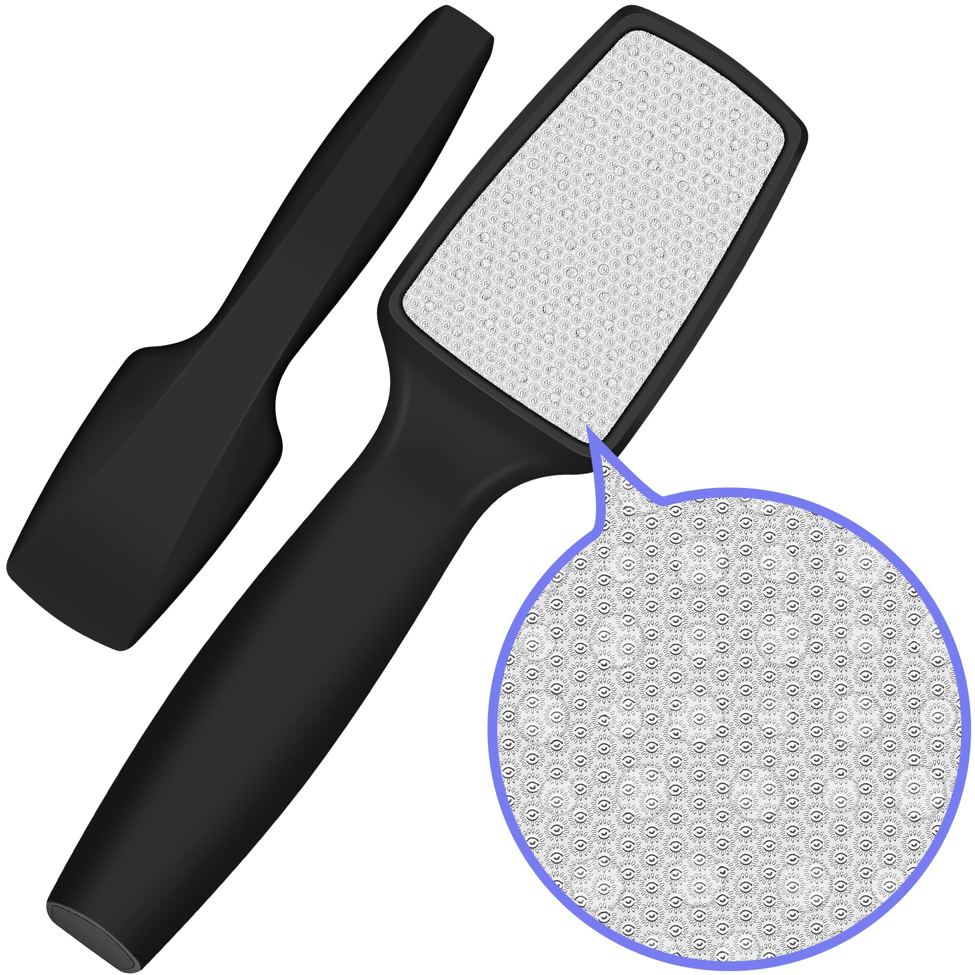 ?SERVICE PROMISE?Any quality problem with our foot files please don't hesitate to contact us, we will reply to you within 24 hours. We take great pride in serving our fellow American customers. ?THIS FILE IS A DREAM?Congratulations, you've found the holy grail of foot files. If you are currently using a foot file that can double as a cheese grater, and fear the metal teeth will snag on the split skin, cutting too deep. If you love to be barefoot out in your garden or outside leave your tootsies and heels quite dry and callused we call them alligator feet. But, you get it, it was a process to make your feet presentable without being bloodied from the cheese grater-style files. ?SAFE AND COMPREHENSIVE? Unlike traditional Sharp metal foot files, our pedicure files do not carry any risk of injury. Whether you use it before or after washing your feet, it will gently and effectively remove the rough skin. It is recommended to use after soaking your feet in warm water, which will be more effective in caring for and improving cracked heels. This foot file takes a minute to get going smoothly but once you learn the right pressure for the strokes, it works beautifully. ?EASY TO CLEAN AND GOOD GRIPS?The foot file handle is made of ABS plastic luxury matte black, comfortable to hold, and doesn't slip out of your hand. Large and light, ready to use right out of the box, no need to charge, no need to replace sandpaper. The foot file is quick to clean, just rinse it directly under a tap. Let your foot file dry out on a soft towel, continuously remove dead skin and calluses for you, enjoy salon pedicures at home comfortably, and save time and money!. ?PEDI FOOT FILE?Our pedicure foot file has a long-lasting 100% stainless steel surface and is designed to be used on both wet and dry feet, to instantly eliminate callus, for soft and beautiful feet. Compared with traditional foot files, the raised surface with sunflower pattern is easily used without hurting the skin. Let your feet become baby-soft, smooth, and beautiful again.