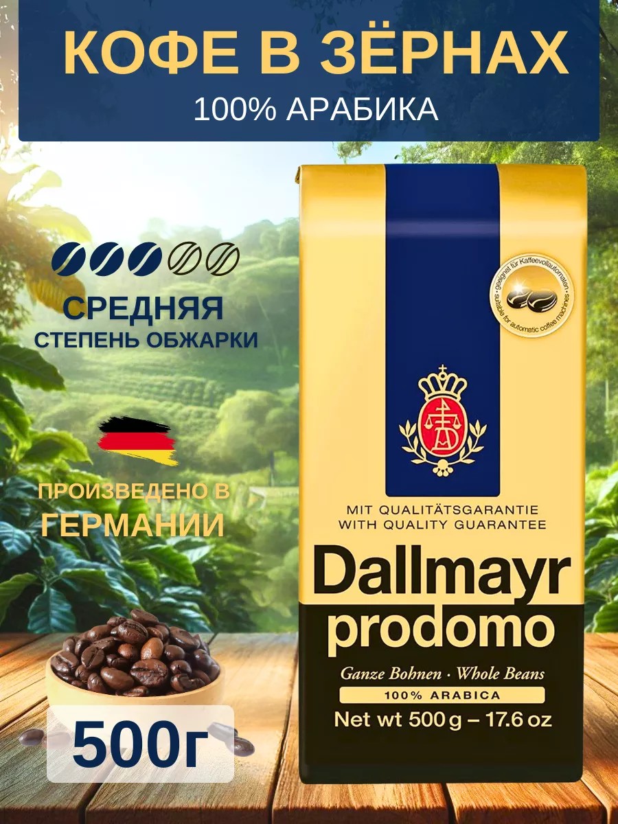 Кофе в зёрнах Dallmayr Prodomo 100% Арабика - это отборная смесь премиальных сортов высокогорной арабики из лучших регионов мира. Дальмайер продомо отличается особенным вкусом и ароматом. Типичный вкус в первую очередь исходит от зерен арабики, выращенных в плодородной южной провинции Эфиопии. Это не просто кофейный напиток, это настоящее искусство. Его насыщенный аромат и мягкий благородный вкус с нормированным содержанием кофеина делают его неповторимым. Благодаря специальной обработке полностью освобожден от раздражающих и горьких веществ. Эта изысканная смесь лучших сортов имеет особенно низкую кислотность благодаря бережному и медленному процессу обжарки. Чтобы гармонично дополнить удовольствие от наслаждения мягким вкусом, зерна обжариваются с особой тщательностью. Это позволяет нежному аромату прекрасно раскрыться в чашке. натуральный зерновой кофе отлично подойдёт для приготовления в кофемашине для любого вида кофейного напитка: эспрессо, американо, латте, капучино. Благодаря своему происхождению является идеальным выбором для кофейных гурманов и любителей кофе из всех возрастов.