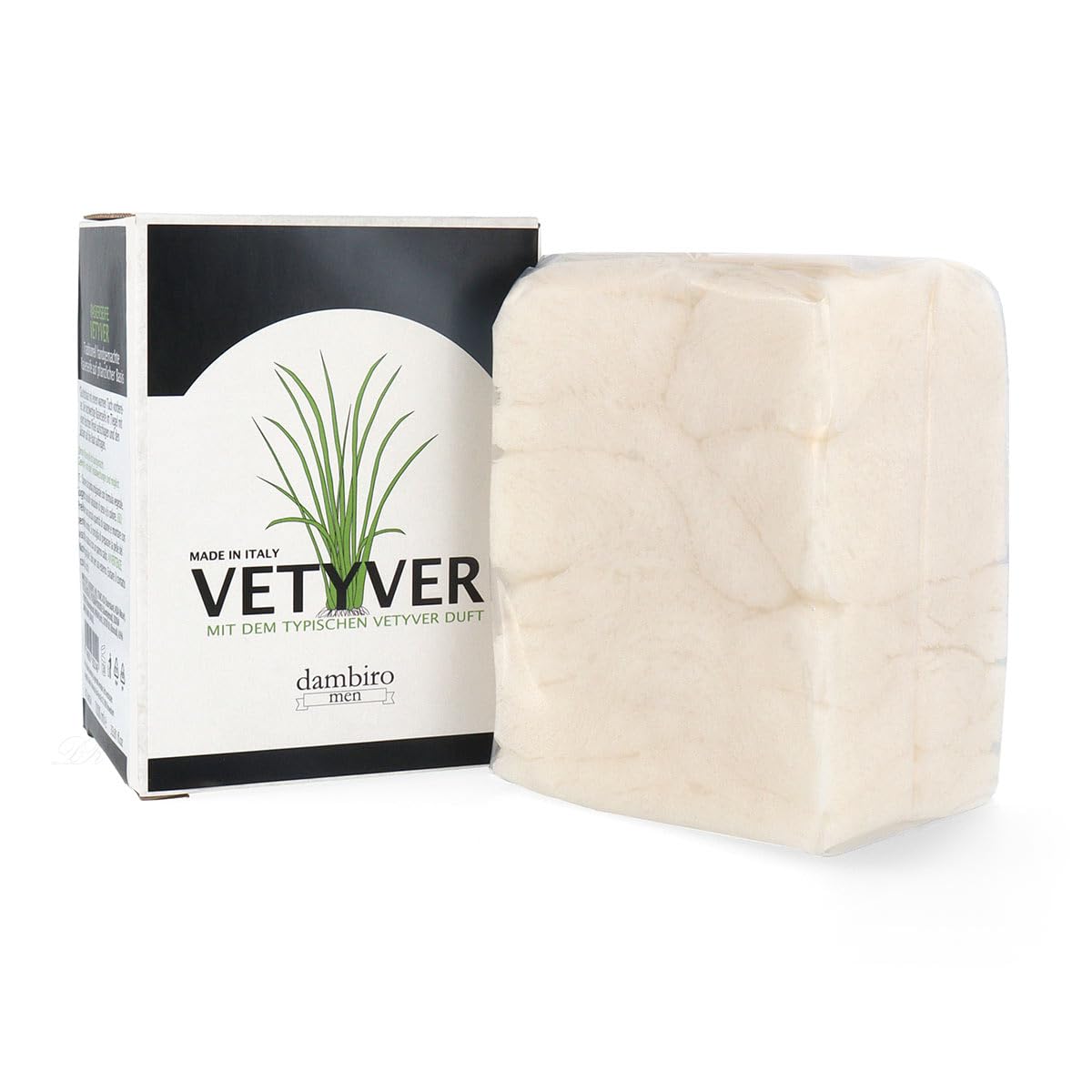 Vetyver zeepbar en verpakking. Witte rechthoekige zeep naast de doos met een groen grasachtig ontwerp. Doos met het label 'Vetyver' en 'dambiro',