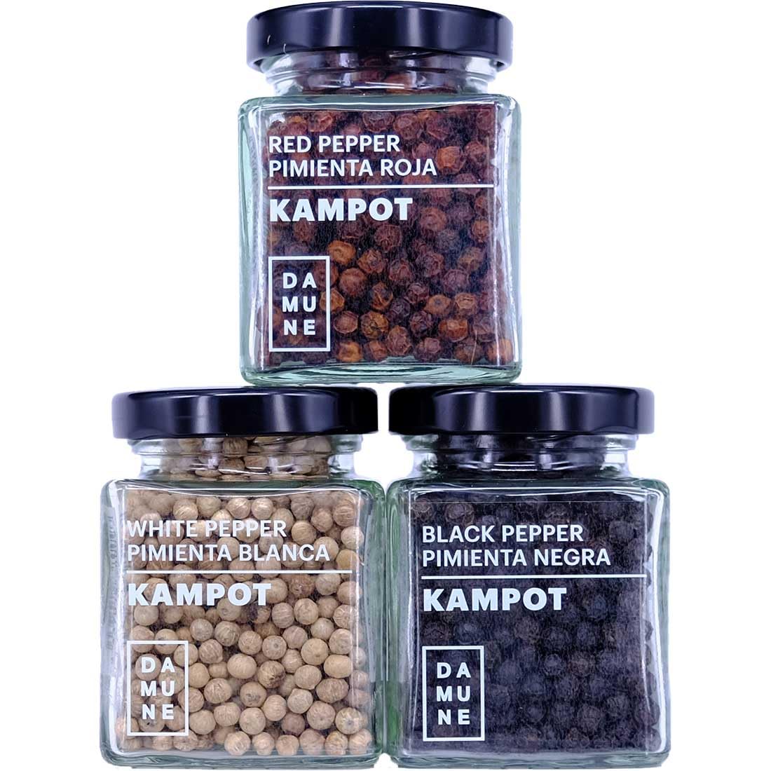 : Renowned for its strength and delicate aroma, ranging from intensely spicy to slightly sweet, its unique flavor is due to a combination of factors: mineral-rich soil, cultivation in a region between the mountains and the sea, abundant rainfall, sunshine, and traditional farming methods. Considered the king of peppers because of its complex flavors and spicy aroma, it was considered an essential condiment by leading chefs and gourmets in French cuisine in the mid-20th century. However, it disappeared from the global market due to measures taken by the Khmer Rouge regime. Its extensive replanting began in the 1990s. The peppercorns are hand-picked one by one by highly experienced farmers who cultivate them without the use of pesticides or chemical fertilizers. Health Benefits Increases gastrointestinal enzyme secretion, contains a good amount of minerals such as potassium, calcium, zinc, manganese, iron, and magnesium. Good source of antioxidant vitamins, antioxidant polyphenols, and flavonoids. Ingredients: PepperGlass jar with a screw-on lid (thus minimizing contact with air and the elements). Dimensions: 5 x 5 x 6.7 cm. Kampot White Pepper - Cambodia: with a powerful bouquet and delicate aromas, its intense, spicy flavor hides notes of fresh herbs and lime. Fabulous on fish, salads, and vegetables. Kampot Red Pepper - Cambodia: less pungent than black pepper, this pepper offers a powerful, fruity aroma with sweet notes of red berries and honey. Perfect with meats, fish, and desserts. Kampot Black Pepper - Cambodia: with an intense flavor that develops slowly, it reveals floral aromas of eucalyptus and mint. Perfect in salads, pasta, and meat dishes. Kampot pepper is grown naturally, following the essential principles of organic farming in soil management and conservation, pest control, and the preservation of plant varieties.Description du produit Célèbre pour sa force et à la fois pour son arôme délicat allant d'intensément épicé à légèrement sucré. Sa saveur unique est due à une combinaison de plusieurs facteurs: des minéraux riches dans le sol, une culture dans une zone entre la montagne et la mer, des pluies abondantes, du soleil et les méthodes traditionnelles de culture des agriculteurs. Considéré comme le roi des poivres en raison de ses saveurs complexes et son arôme épicé, il est considéré comme un condiment essentiel par les plus grands chefs et gourmets de la cuisine en France au milieu du XXe siècle. Cependant, il a disparu du marché mondial en raison des mesures prises par le régime des Khmers rouges. Sa vaste replantation a commencé dans les années 90. Les grains de poivre sont cueillis à la main un par un par des agriculteurs de grande expérience qui les cultivent sans utiliser de pesticides ou d'engrais chimiques. Bénéfices pour la santé Augmente les sécrétions d'enzymes gastro-intestinaux, contient une bonne quantité de minéraux comme le potassium, le calcium, le zinc, le manganèse, le fer et le magnésium. Bonne source de vitamines antioxydantes, polyphénols antioxydants et flavonoïdes. Ingrédients PoivrePot en verre avec couvercle dévissable (évitant ainsi au maximum son contact avec l'air et les éléments extérieurs). Mesures : 5 5 6,7 cm. Poivre Blanc de Kampot - Cambodge: avec un puissant bouquet et des arômes délicats, sa saveur intense et épicée cache des notes d'herbes fraîches et de citron vert. Fabuleux sur des poissons, salades et légumes. Poivre rouge de Kampot - Cambodge: moins piquant que le poivre noir, ce poivre offre un arôme puissant et fruité, avec des notes douces de fruits rouges et de miel. Parfait dans les viandes, poissons et desserts. Poivre noir de Kampot - Cambodge: avec une saveur intense se construisant lentement, il révèle des arômes floraux d'eucalyptus et de menthe. Parfait dans les salades, les pâtes et la viande. Le poivre de Kampot est cultivé naturellement en suivant les principes essentiels de l'agriculture biologique dans la construction et la conservation des sols, la gestion des nuisibles et la préservation du patrimoine des espèces.DAMUNE Poivre en grains de Kampot Premium: Noir (60g), Rouge (60g) et Blanc (60g)