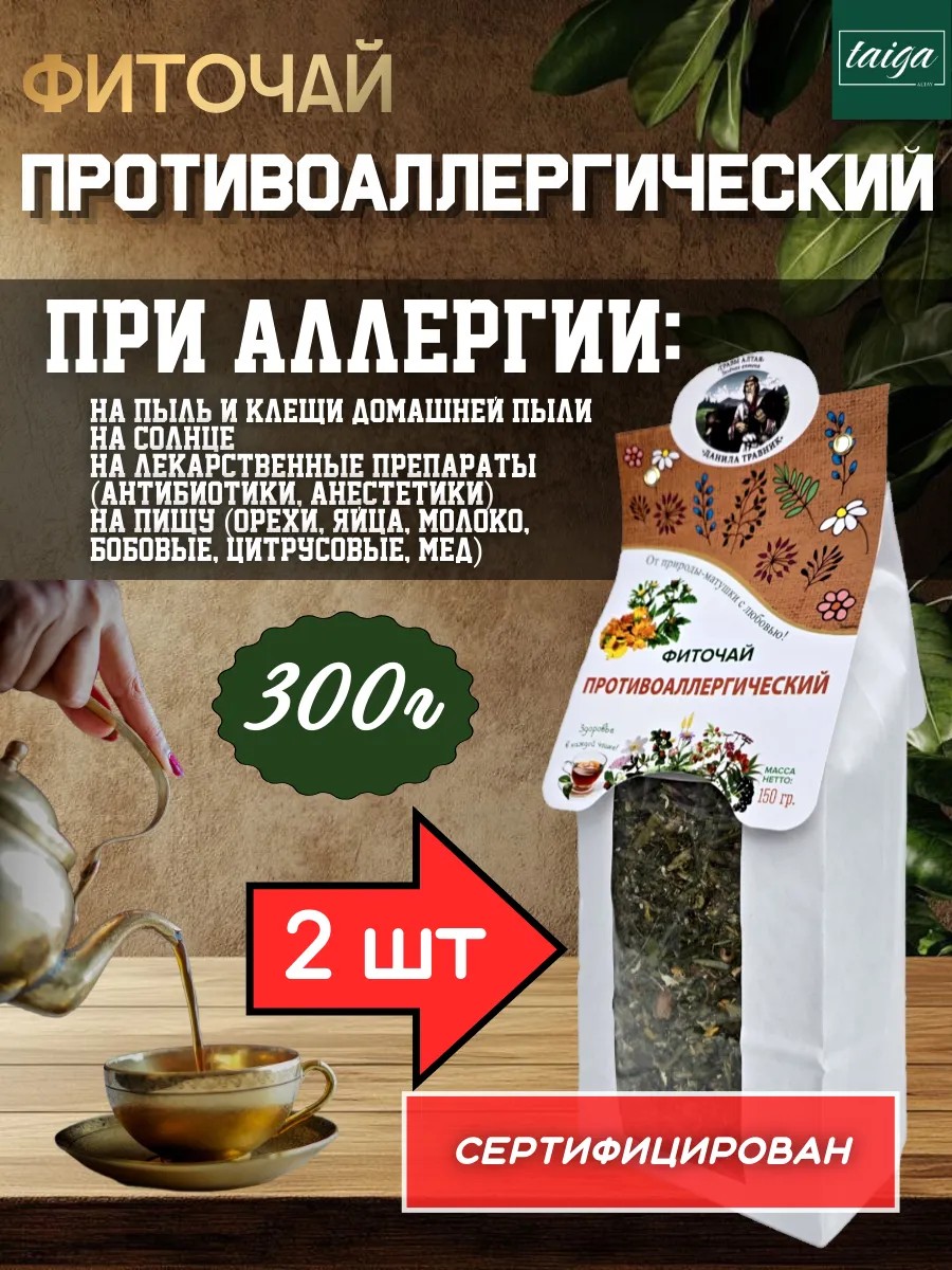 Фиточай рекомендуется при аллергии: на пыль и клещи домашней пыли; на солнце; на лекарственные препараты (антибиотики, анестетики); на пищу (орехи, яйца; молоко, бобовые; цитрусовые, мед); на плесень; на укусы и выделения насекомых; на шерсть; слюну и выделения животных. А также на латекс; на металлы; на химические чистящие средства; на пыльцу цветущих растений; на чужеродные белки (в донорской плазме и вакцинах). ПОВЫШАЕТ ИММУНИТЕТ.
