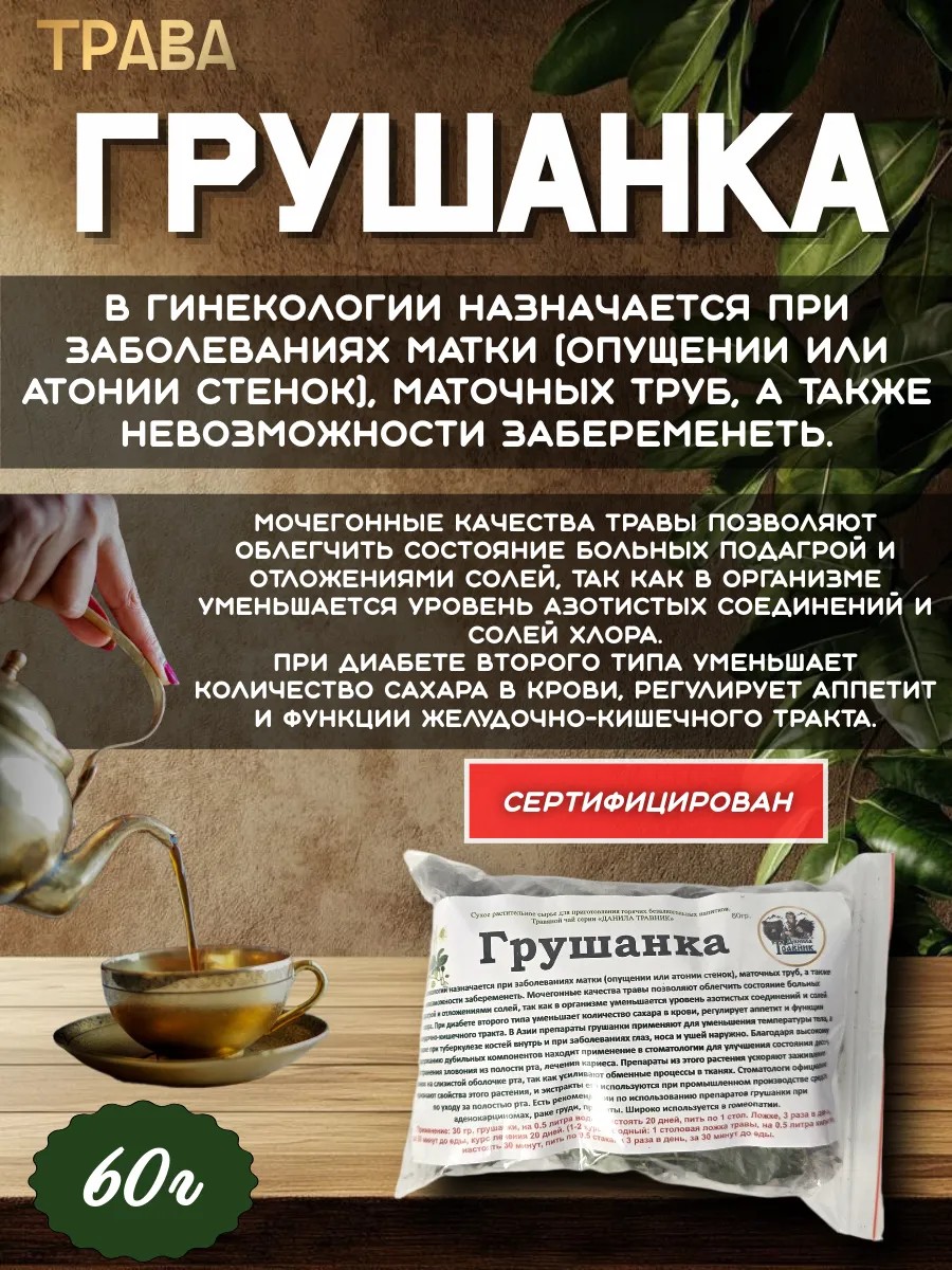 | Назначение травяного сбора | при заболеваниях матки (опущении или атонии стенок),; маточных труб, а также невозможности забеременеть.; При диабете второго типа уменьшает количество сахара в крови |