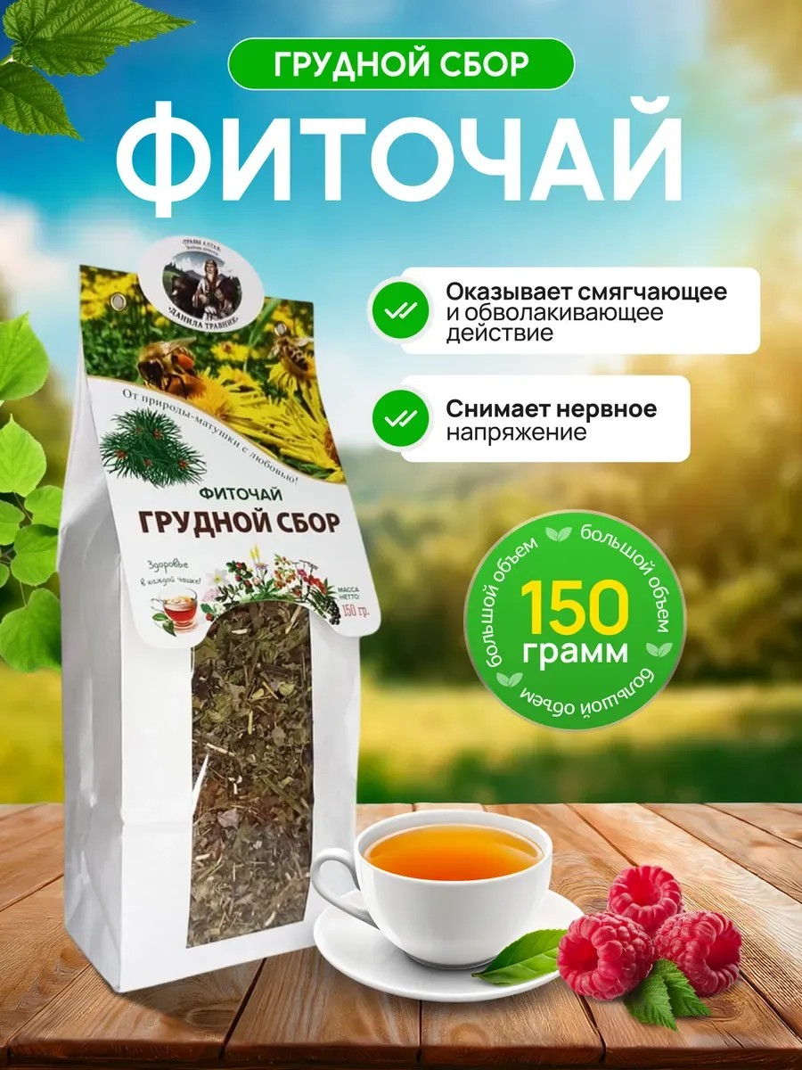 | Особенности продукта | фито чай, травяной сбор; грудной сбор от кашля, боли горла, бронхите, воспаления легких; без добавок, полностью натуральный продукт 100% |