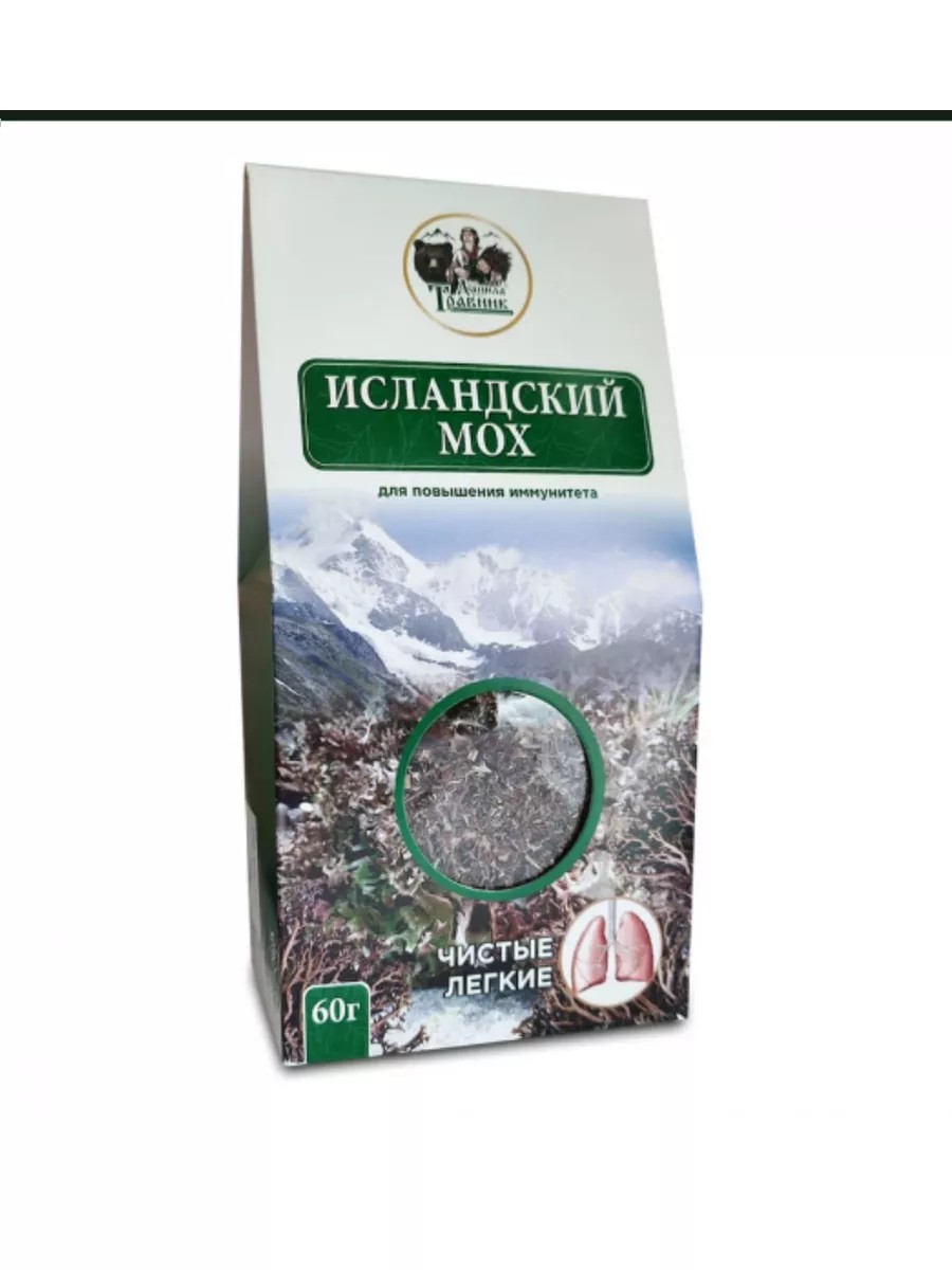 Исландский мох. Один из лучших растительных антибиотиков, значительно повышает иммунитет, повышая сопротивляемость организма к различным вирусам (заболеваниям), оказывает противомикробное действие, при простудных заболеваниях, как отхаркивающее средство, бронхите, бронхиальной астме, для профилактики и лечения желудочно-кишечных заболеваний, гастрите, расстройствах пищеварения.