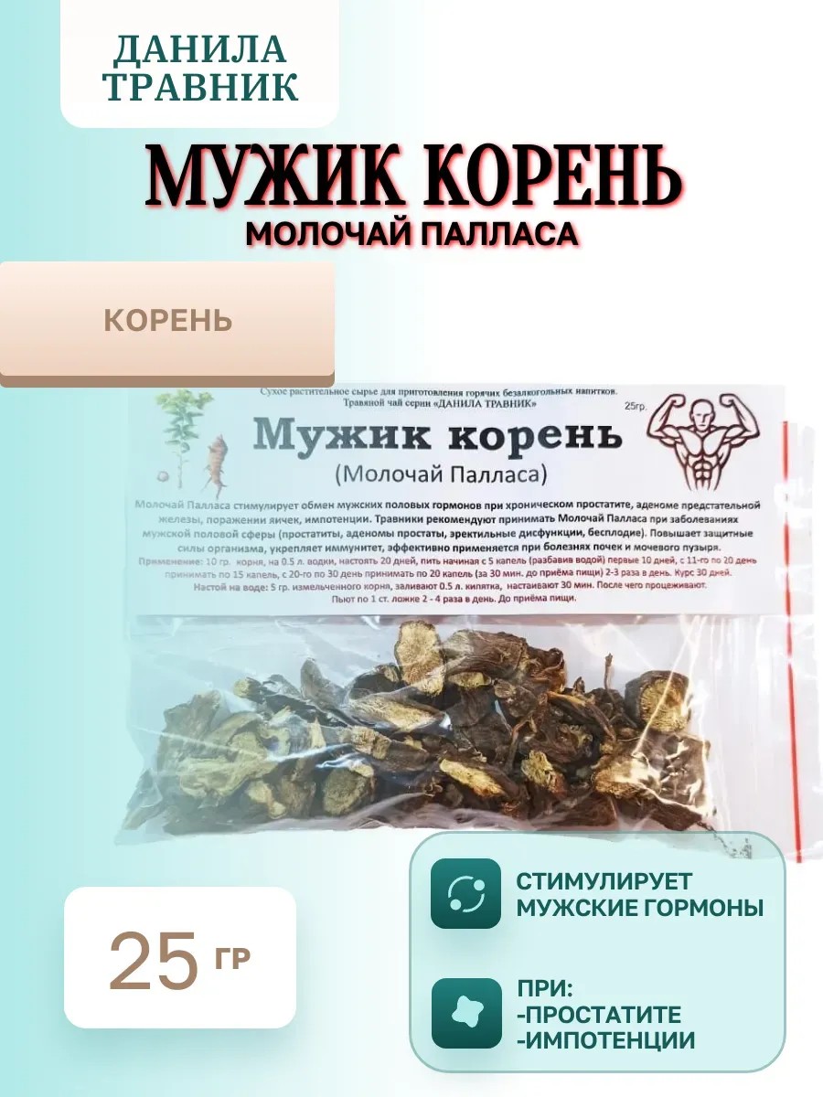 Мощный природный биостимулятор мужского здоровья – Мужик-корень (молочай Палласа) Данила Травник. Собранный в экологически чистых районах Алтая, этот легендарный корень веками использовался в народной медицине как лучшее средство для мужской силы и общего оздоровления организма.