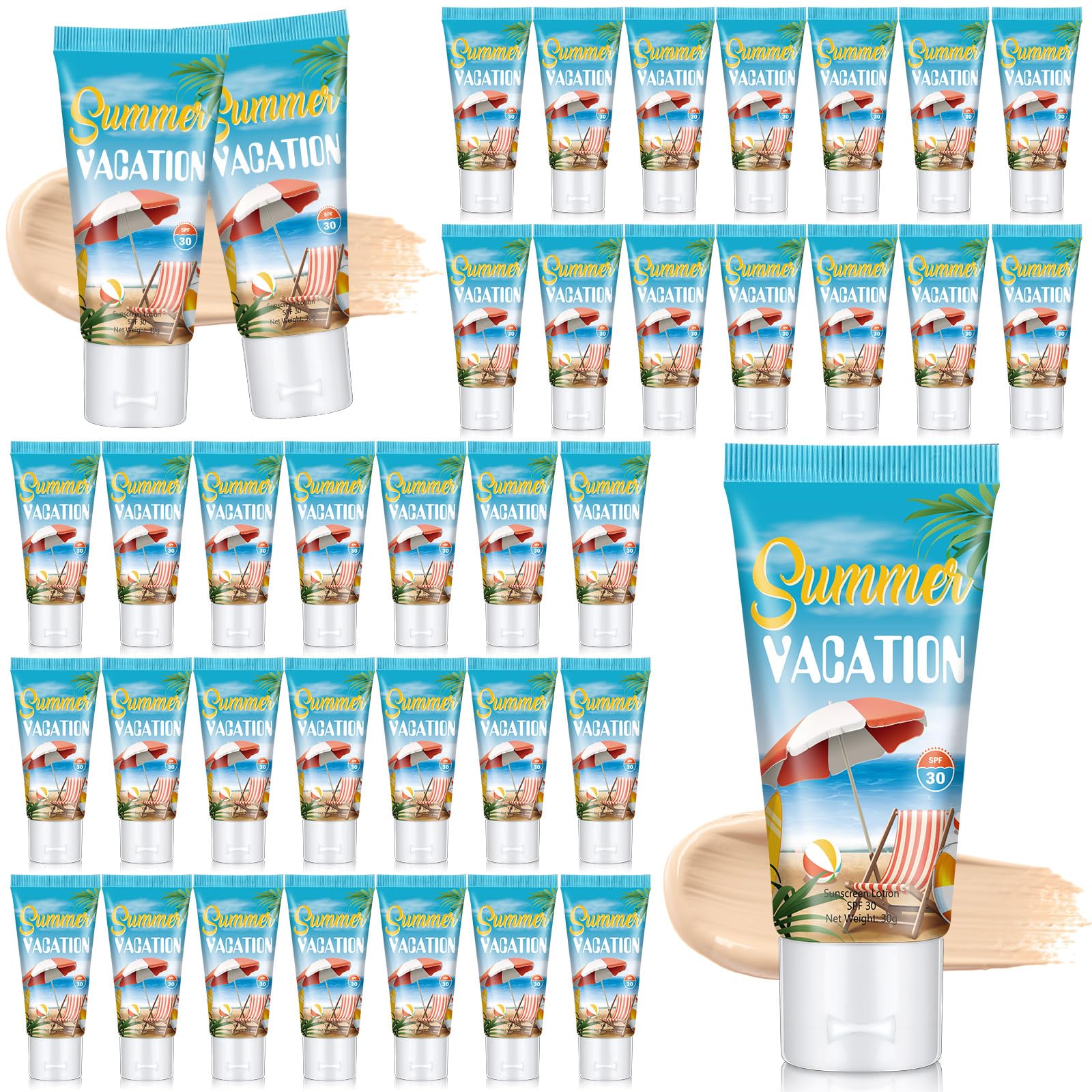 Features: Good present choice: Our mineral sunscreen makes a thoughtful and warm gift for your friends, families, and workmates. Your loved ones will genuinely appreciate this caring gesture, and it's a nice way to show them how much you value their skin health. Multifunctional sunscreen: The sunscreen for skin allows you to enjoy the sun without worrying about UV damage. At the same time, it can also effectively resist radical damage to the skin, keep the skin white and youthful. Specifications: Material: water, glycerin, mineral oil, ethylhexyl palmitate, titanium dioxide, sorbitan oleate Size: approx. 3.94 x 1.81 inches 10 x 4.6 cm, 1oz 30g (weight) Color: as picture shown Package includes: 36 x Summer vacation sunscreen bulk Notes: Manual measurement, please allow slight errors on size. The color may exist a slight difference due to different screen displays. Our product is not suitable for sensitive skin. Test whether there is any allergy on a small part of your skin before use. Please stop applying if there is any discomfort.Applicable All Year Round: summer vacation party sunscreen is essential and suitable for use in various climate conditions For better results, please apply it regularly, and you can share it with family and friends, so that everyone can share sunscreen together. Method of Application: please apply sunscreen to all skin areas 15 minutes before sun exposure and avoid the eye area Moreover, remember to re-apply it after 80 minutes if you're swimming or sweating for the maximum protection. Safeguard Your Skin: our organic sunscreen serves as an ultimate skin protection from harmful sun rays It provides robust sun protection throughout the summer without the need for heavy makeup and is suitable for both face and body Use our sunscreen to bolster your everyday sun protection regimen and deflect harmful UV rays. Packed with Natural Ingredients: this travel size sunscreen is loaded with beneficial and natural ingredients including water, glycerin, mineral oil, ethylhexyl palmitate, titanium dioxide and sorbitan oleate This sunscreen effortlessly applies on all skin types, ideal for all skin tones, and slows skin aging caused due to prolonged exposure to UV rays Note: please moisturize before applying sunscreen, it will be more even and easy to apply. Package Contents: you will receive 36 pieces of summer vacation party mini tinted sunscreen, 1 oz travel size sunscreen lotion, sunscreen cream measures approximately 3.94 x 1.81 inches 10 x 4.6 cm, plenty of quantity, ideal for gifting choice.