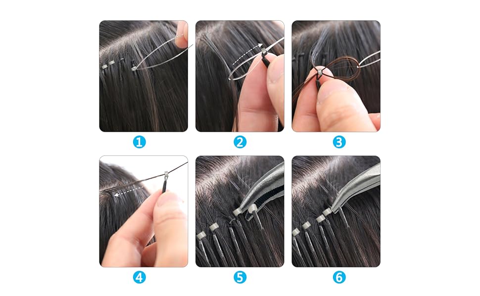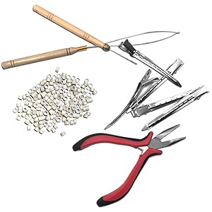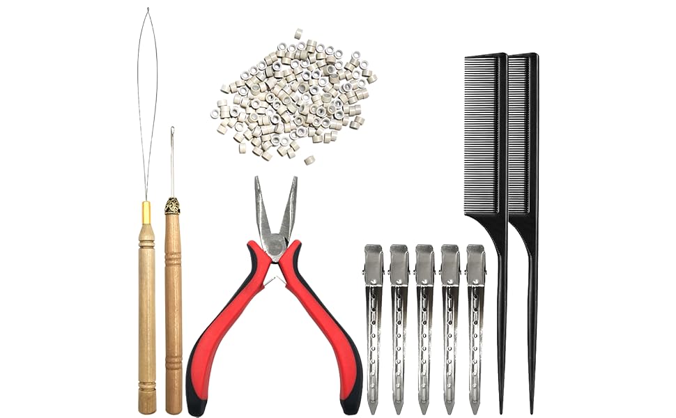 Wide area of ??application: The tool for hair extensions is a necessary set to do it yourself.Suitable for most hairstyles, a perfect helper for hair extensions.Ideal for professional hairdressing salons, weddings, parties and at home.Great helper: Silicone rings can hold hair tight without causing damage to the hair.With an additional 2 combs and 5 hair clips, they work well for the parting of sections and the hairline when applying hair extensions.Easy to use: the pliers are easy to keep, the pliers with a curved head for simple use, the hook is easy with a wooden handle, comfortable to grip, good for hair extensions, practical design.Material: made of metal, wood and silicone.The curved pliers are perfect for hair extensions.The hooks are practically to extend and decorate the hair.Scope of delivery: 200 x beige silicone microring, 1 x pliers, 1 x pull hook, 1 x pearl device, 2 x combs and 5 x crocodile hair needles.Professional hair-styling tool set.Breiter Anwendungsbereich: Das Werkzeug für Haarverlängerungen ist ein notwendiges Set zum Selbermachen. Geeignet für die meisten Frisuren, ein perfekter Helfer für Haarverlängerungen. Ideal für professionelle Friseursalons, Hochzeiten, Partys und Zuhause. Großartiger Helfer: Silikonringe können Haare fest halten, ohne Schäden an den Haaren zu verursachen. Mit zusätzlichen 2 Kämmen und 5 Haarspangen, funktionieren sie gut zum Scheiteln von Abschnitten und um den Haaransatz beim Auftragen von Haarverlängerungen. Einfach zu bedienen: Die Zange ist einfach zu halten, die Zange mit gebogenem Kopf für einfache Verwendung, der Haken ist leicht mit einem Holzgriff, bequem zu greifen, gut für Haarverlängerungen, praktisches Design. Material: aus Metall, Holz und Silikon. Die gebogene Zange ist perfekt geeignet für Haarverlängerungen. Die Haken sind praktisch zum Verlängern und Dekorieren des Haares. Lieferumfang: 200 x beigefarbene Silikon-Mikroringe, 1 x Zange, 1 x Zughaken, 1 x Perlen-Gerät, 2 x Kämme und 5 x Krokodil-Haarnadeln. Professionelles Haar-Styling-Werkzeug-Set.DanziX Haarverlängerungs-Set, Zange, Zughaken, Perlen, Werkzeug-Set, 200 Stück, beigefarbene Silikon-gefütterte Mikroringe, Perlen, 2 Kämme, 5 Stück
