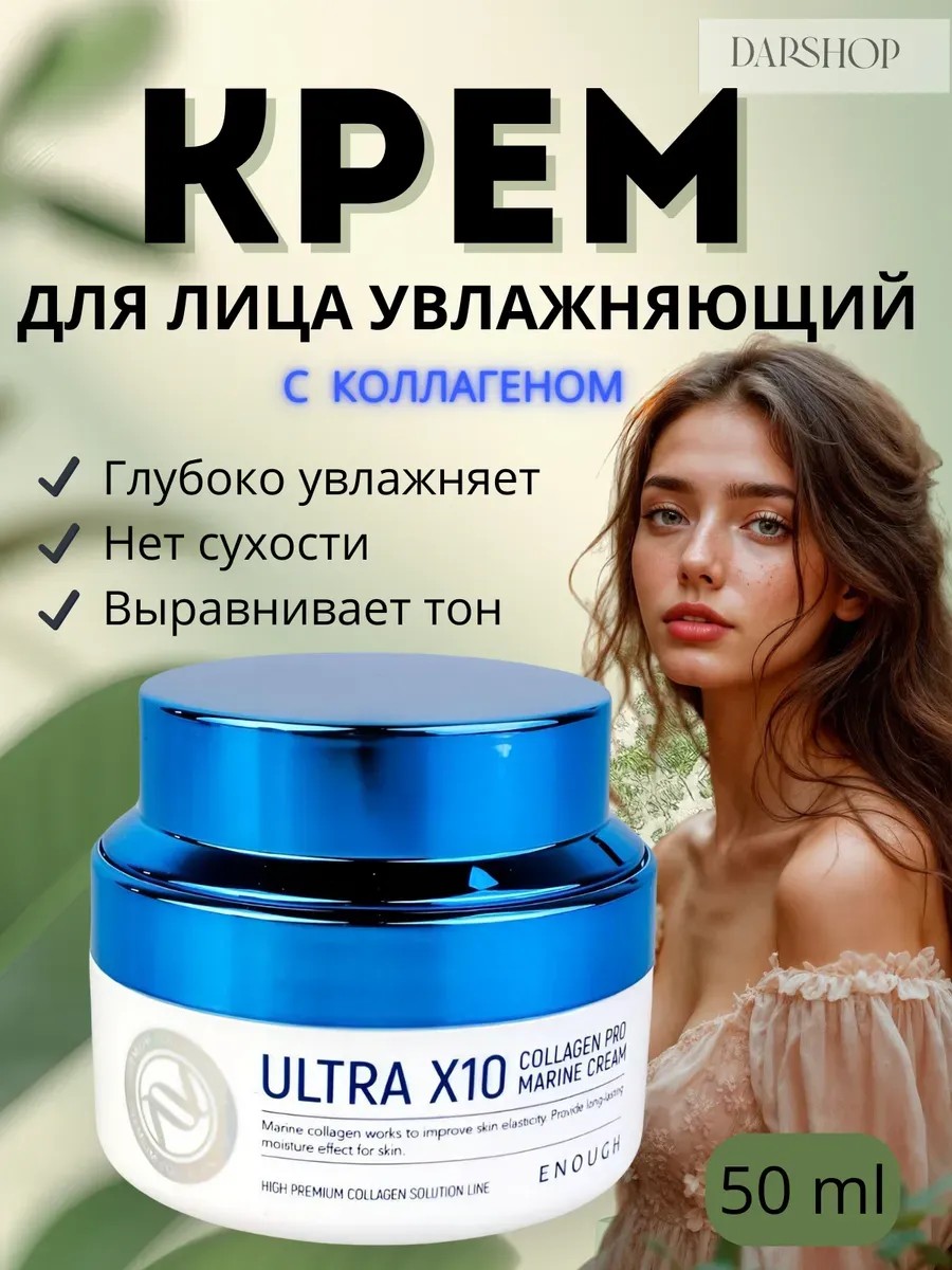 Korean cosmetics and moisturizing face cream will help you achieve beautiful and virtually perfect skin. ENOUHG ULTRA X10 collagen pro marine cream moisturizing face cream. Restores, renews, and rejuvenates skin at the cellular level. Benefits: normalizes hydrolipid balance, maintains optimal moisture levels in cells, strengthens the skin's protective functions, smoothes wrinkles, and tightens the facial contours. Makes skin firm and smooth, increases elasticity. Fights sagging skin, smoothes wrinkles. Gives the skin a fresh and velvety texture, evens out skin tone. This face cream improves the appearance of the skin, reduces redness and inflammation. Designed for intensive cellular regeneration, this Korean face cream provides a pronounced whitening, lifting, rejuvenating effect, improving elasticity, from the first use. Moisturizing face cream - softens and smoothes the skin. Improves skin tone, makes it bright and fresh, and imparts a velvety, soft feel. Moreover, enough cream has a prolonged cumulative effect that helps maintain the skin's youthfulness and beauty, improves its firmness and elasticity, strengthens the skin's structure, tightens the facial contours, and slows the aging process (Anti-Aging Face Cream 60). Suitable for all types of mature skin.