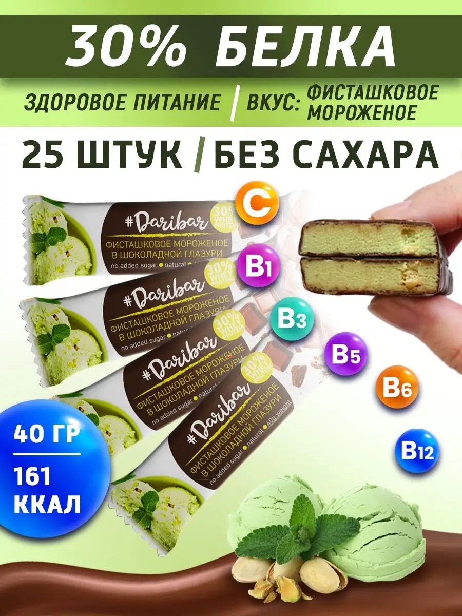 Dari Bar 30% Protein Glazed Protein Bars, Sugar-Free, Gluten-Free Sweets, Pistachio Ice Cream, 40g, 25 Count. Dari Bar chocolate bars satisfy hunger and provide a long-lasting, reliable source of energy, providing energy without weight gain, unlike sugary desserts, buns, or cakes during lunch. Whether you're stuck in a traffic jam or at the office, relaxing with friends or attending classes, on a bike ride, or at the gym, use Dari Bar bars to replenish your energy when you can't eat a full meal or between meals! Dari Bar bars contain vitamins and minerals, various types of protein, fiber, and special active ingredients. Importantly, they're designed not only for athletes but for anyone watching their diet. Glaze ingredients: cocoa butter substitute, lecithin emulsifier, cocoa powder, whole milk powder. No added sugar. Additional ingredients: brownie topping, pistachio flavoring.