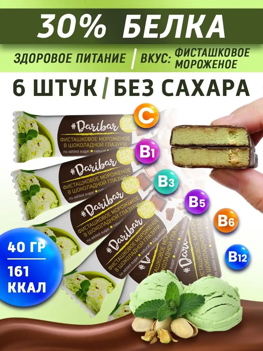 Glazed Protein Bars, Sugar-Free, Gluten-Free, 30% Protein, Pistachio Ice Cream, 40g, 6 pcs. DariBar is a line of protein bars containing 30% protein. Their vibrant designs and rich flavors make them a favorite dessert that's beneficial for your figure and health. This line of protein bars is designed primarily for taste, offering a healthy alternative to traditional confectionery for the modern consumer.