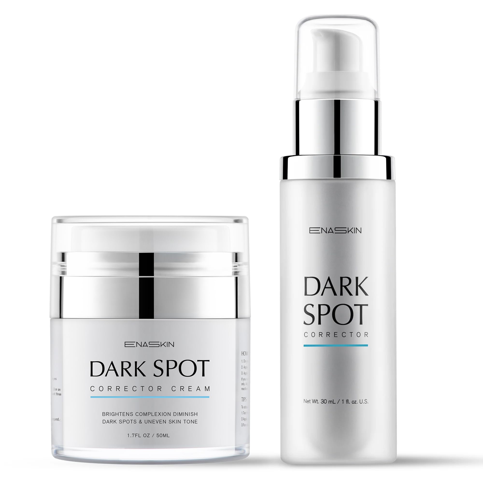 Achieve visibly brighter, more even-toned skin with our Dark Spot Remover Duo – a comprehensive 2-step system featuring a high-potency serum and a deeply nourishing cream. Powered by clinically proven ingredients like Niacinamide, a-Arbutin, Vitamin E, and Tranexamic Acid, this combo is designed to tackle dark spots, sun damage, melasma, freckles, and other forms of hyperpigmentation. The serum works deep within the skin to accelerate cell turnover and fade discoloration, while the cream hydrates and strengthens the skin barrier, locking in moisture for a glowing, smooth finish. Ideal for both men and women, our dual-action formula is suitable for all skin types – even sensitive skin. Incorporate into your daily skincare routine for visible improvement in just a few weeks. Give your skin the love it deserves – clarity, radiance, and confidence in every drop.Visible Results in Weeks – Expect noticeable skin improvements in 1–2 weeks, a reduction in dark spots in 5–6 weeks, and full clarity in 7–8 weeks with consistent use. Safe for All Skin Types – Gentle yet effective formulas suitable for sensitive skin, free of parabens, mineral oils, artificial dyes, and animal testing. Cruelty-free and gluten-free. Day Night Routine Ready – Use the lightweight serum in the morning and the hydrating cream at night for round-the-clock treatment that restores skin clarity and texture. Clinically Proven Ingredients – Features Niacinamide, Alpha-Arbutin, Vitamin E, Licorice Root, and Tranexamic Acid to effectively fade dark spots and support a radiant, even-toned complexion. 2-Step Dark Spot Corrector System – This powerful combination includes both a fast-acting serum and a nourishing cream to target age spots, melasma, sun spots, freckles, and hyperpigmentation on the face and body.