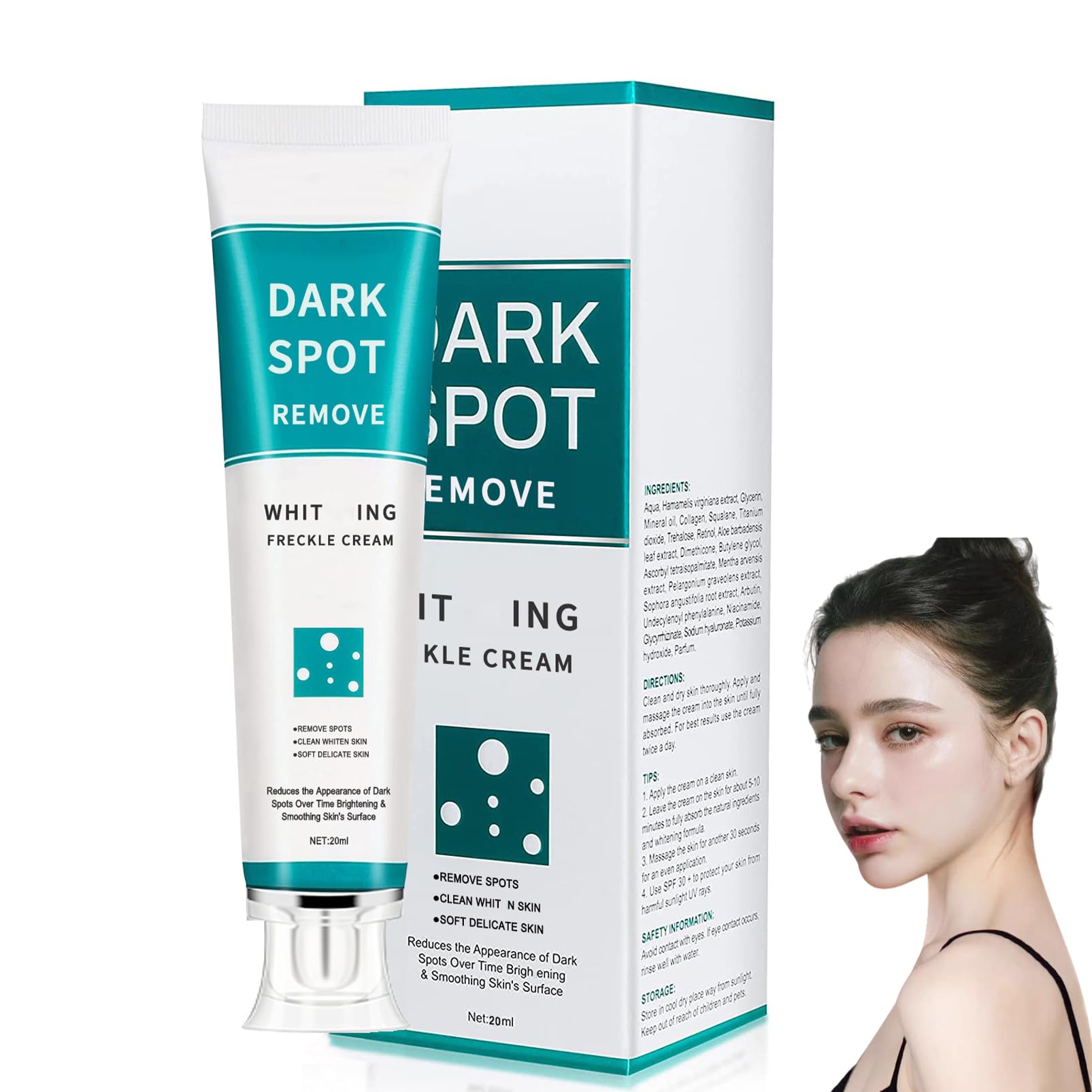 Dark Spot Remover For Face Are Dark Spots Preventable? They can be! Most importantly, prevent dark spots by wearing SPF every single day both during and after the treatment. Even if you don’t think you spend much time in the sun, the cumulative impact of your daily exposure adds. Our freckle remover inhibit melanin production and transportation as well as soothing & repairing, thus rapidly reduce the look of uneven skin tone. Make your skin while performing the hyperpigmentation treatment. Best choice for melasma freckle remover and liver spot corrector. Benefits: 1. For all kinds of spots 2. Moisturize & hydrates skin. 3. Smooth your skin. 4. Combats signs of aging such as wrinkles. Target Different Types of Dark Spots: 1.Spots including freckles, post acne spots, sun spots and discoloration, which usually caused by harmful factors, such as sun damage and inflammation. 2.Hyperpigmentation including age spots , melasma, brown & gray spots, which usually caused by internal factors. 3.Our dark spot cream promotes an even skin tone by fading discoloration around the cheeks, forehead, nose & chin. The enhanced formula takes on stubborn brown & dark spot, hyperpigmentation treatment, age spot, sun spot, redness, melasma and post-acne marks. It is recommended daily applying scar cream once in the AM and PM. Suitable for Skin Types: 1. Oily 2. Dry 3. Combination 4. Sensitive ( patch test is necessary ) How To Use: Step1: Before initial use hyperpigmentation cream, apply a thin layer on a small area of skin. Wait 24 hours, If no any excessive side effects, you can add to your skin care. Step2: Continue Use, Begin with once or twice every day. Allow your skin to build a tolerance. Insist on using it for 2-4 weeks. Till get a visible improvement, go on for 2-3 months. Step3: In daily life, pay attention to sun protection. DIRECTIONS Step 1: Apply a thin layer on a small area of skin and wait 24 hours. Step 2: Continue use, begin with once or twice every day and insist on using it for 2-4 weeks. Step 3: Pay attention to sun protection. SAFETY WARNING no See more???For Day and Night Use?By day, skin bleaching cream helps defend against the damage that can cause future spots. This dark spot remover amplifies skin's natural luminosity. By night, our spot treatment for face works naturally with skin's rhythm and scar removal cream begins to significantly reduce the look of dark spots, sun spots, post acne marks, dullness and redness. ???Anti-Aging & Wrinkles?Melasma treatment for face contains nicotinamide aicd and hyaluronic acid. Hyaluronic effectively treats wrinkles & fine lines, help replacing old skin cells with newer, healthier ones. Acne scar treatment helps fight against wrinkles and spots, the high-performance formula helps enhance skin strength and elasticity, melanin correcting facial serum minimizes the appearance of fine line & wrinkles, discoloration correcting serum reduce the depth of wrinkles. ???Principles to Remove Dark Spots?Nicotinamide acid known as its potent function to accelerate metabolism, protect against sun damage, pigmentation treatment minimizes fine lines and wrinkles will block melanin thus reducing dark areas and improving skin, whereas acne cream works to inhibit the excessive secretion of melanin to improve the dark spot areas to achieve better effect. ???Powerhouse Improve?Our Face Cream Dark Spot Corrector light texture leaves non-greasy f??ling, absorbed fast. Improve your skin while performing the hyperpigmentation.The freckle cream is added with sodium hyaluronate, which can effectively improve the spots, at the same time, deeply replenish water and moisturize the skin, which is an essential skin care product for confident and beautiful women!. ???Dark Spot Corrector?Spot cream contains powerful and effective ingredients that works deeply in the skin to reduce dark spots, hyperpigmentation, scars, discoloration, melasma, uneven tones on the face and body, back acne treatment to give you an even new skin tone.