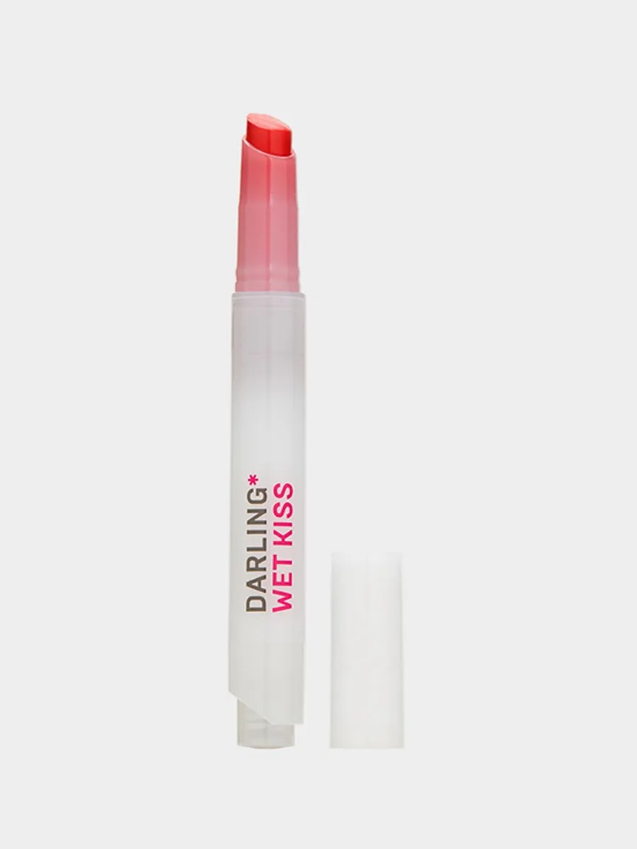 DARLING* Wet Kiss, a translucent gloss lipstick with a melting jelly texture and a cooling menthol effect, instantly visually plumps lips. The light, weightless formula softens and moisturizes without leaving a sticky feeling.