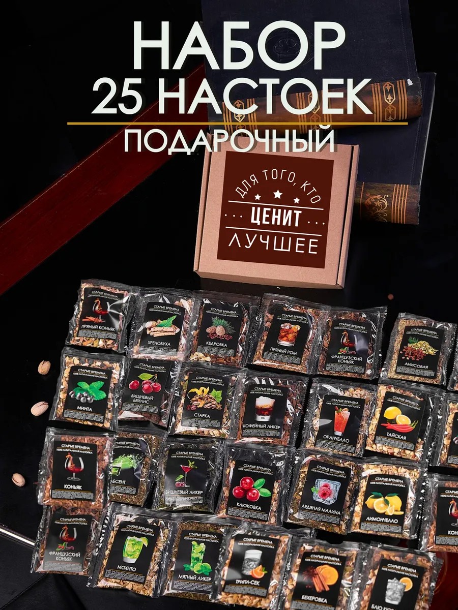 Вы ищете подарок для мужчины? Подарочный набор для приготовления настоек с разнообразными специями и традиционными рецептами- оригинальный и нужный подарок! Набор настоек для мужчин позволит экспериментировать со вкусами и создавать уникальные настойки. Алкоголь: водка или спирт в набор не входят, вы можете выбрать любую основу и каждый вкус получится особенным и ярким! Можно приготовить такие напитки как: егермейстер, джин, виски, бехеровка, лимончелло. Этот подарочный набор для мужчин никого не оставит равнодушным. В комплекте 25 пакетиков смеси для приготовления настоек для настаивания ароматных и качественных напитков в домашних условиях и подробный рецепт. Этот подарок папе также является универсальным подарком на др, новоселье, брату, дедушке, коллеге, другу, начальнику и любому мужчине, Это не простой алкогольный набор самогонщика или подарочный набор продуктов: настойки для самогона это 25 специи с авторскими заготовками - смесями из натуральных трав со всей страны для настаивания. Данный набор для настоек в фильтр-пакетах, а в нашем магазине DaroLand также имеется набор настоек со специями с бутылками. Коробочка с наполнением в виде необычных, интересных миксов для приготовления алкогольных напитков выступит стильным сувениром и превосходным презентом на 23 февраля, юбилей, день рождения, новый год, любое другое без исключения праздничное мероприятие и даже вовсе без какого-то особого повода.