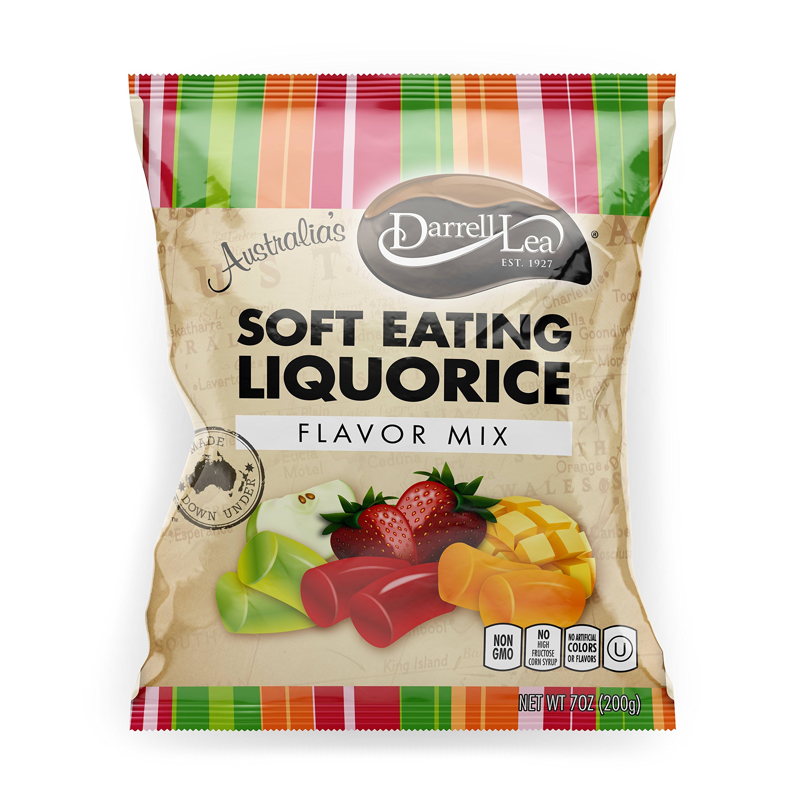 Tradition We've been working hard since 1927 to ensure we bring you the most delicious treats possible. With over 90 years of expertise, more than 100 perfected recipes, and millions of dedicated Australian fans, Darrell Lea is a tradition that runs the Australian way. Learn how the good stuff began. Sharing Our products are made to be shared. And what better way than to bring them to you! Our team is always out and about, making sure our delicious products, packed with tasty crunchy, gooey, chewy bits, are there to brighten your day. Come share the good stuff. Passion A passion for what we do is what has brought so many delicious treats to families across Australia. We are passionate about the idea that all our products are filled with goodness, and we believe this is reflected in the quality and excellence of each product. Come and discover the goodness. INGREDIENTS Wheat flour, sugar, wheat glucose syrup, glycerin, water, palm oil, natural flavoring (strawberry, green apple, mango) with other natural flavors, malic acid, citric acid, salt, licorice extract, colored with black carrot powder, beta-carotene, and turmeric. Contains wheat. May contain traces of egg, milk, peanuts, soy, and tree nuts (almonds, pecans, walnuts, coconut, cashews, and hazelnuts).Darrell Lea, Liquorice Soft Eating - Sans conservateurs, bonbons à réglisse - Saveur mixte - Lot de 8 - 200 gDESCRIPTION DU PRODUIT DESCRIPTION DU PRODUIT Tradition Nous travaillons dur depuis 1927 pour nous assurer que nous vous apportons les friandises les plus délicieuses possibles. Avec plus de 90 ans d'expertise, plus de 100 recettes perfectionnées et des millions de fans australiens Australiens dévoués, Darrell Lea est une tradition ancrée dans toute l'Australie. Apprenez comment les bonnes choses ont commencé. Partage Nos produits sont faits pour être partagés. Et quelle meilleure façon que de vous les amener ! Notre équipe est toujours dehors et s"assure que nos délicieux produits remplis de délicieux morceaux croquants, gluants, gluants, moelleux sont là pour apporter un sourire à votre journée. Venez partager les bonnes choses. Passion Une passion pour ce que nous faisons est ce qui a apporté tant de friandises délicieuses aux familles à travers l"Australie. Nous sommes passionnés par l'idée que tous nos produits sont remplis de bonnes choses, et nous croyons que cela montre à travers la qualité et l'excellence de chaque produit. Venez découvrir les bonnes choses. INGRÉDIENTS Farine de blé, sucre, sirop de glucose de blé, glycérine, eau, huile de palme, aromatisé naturel (fraise, pomme verte, mangue) avec d'autres saveurs naturelles, acide malique, acide citrique, sel, extrait de réglisse, coloré avec poudre de carotte noire, bêta-carotène et curcuma. Contient du blé. Peut contenir des traces d'œuf, de lait, de cacahuètes, de soja et de noix d'arbre (amandes, noix de pécan, noix, noix de coco, noix de cajou et noisettes)