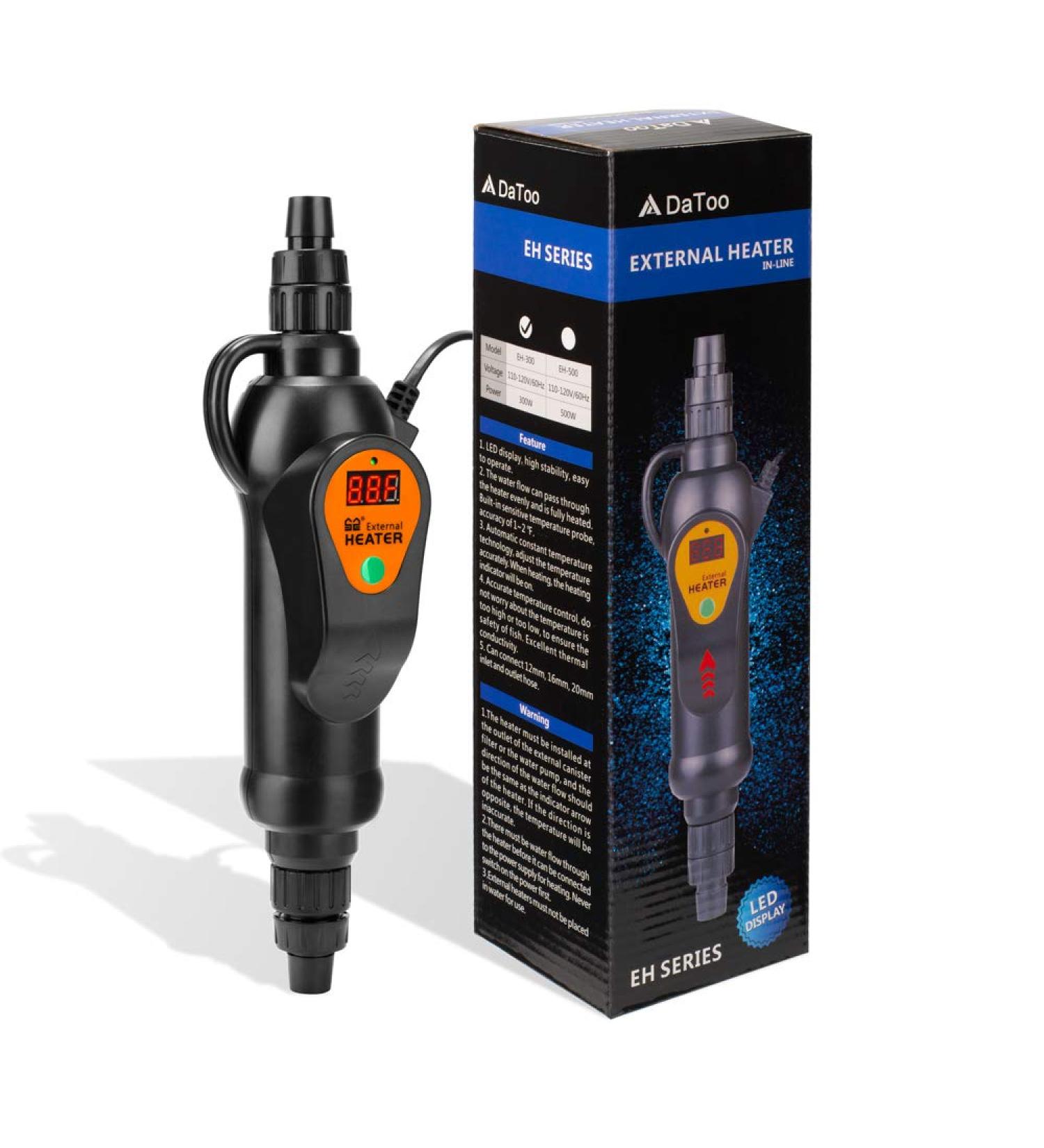 The Best Aquarium External Heater For Your Needs DaToo Aquarium External Heater is specially designed for canister filter. Leading temperature control system, safe overheat protection, sturdy and durable, provides a warm, safe and comfortable living environment for your beloved fish! Specification: Voltage: 110~ 120V/60Hz Power: 300W Temperature Range: 68 ? to 95 ? Heater Size: Fit 1/2" (12mm), 5/8" (16mm) and 20mm Hose Product Features: - Leading temperature control system - Safe Over-Heat Protection - Sturdy And Durable - Replaceable Inlet And Outlet Head(Other brands don't have this) - LED Temperature Display in Fahrenheit - Additional accessories for your needs - Long Service Life - One Year Warranty and 100% Money-back Guarantee Why Do I Select DaToo Aquarium External Heater? 1. LED display, temperature control system is more advanced, STM8 chip. 2. Safe over-heat protection, two temperature sensors, above the set temperature of 0.2 will stop heating. 3. Replaceable Inlet And Outlet Head, fit 1/2" (12mm), 5/8" (16mm) and 20mm Hose 4. Sturdy and Durable, german glass-ceramic heating tube and super-strength ABS shell, longer service life 5. One Year Warranty and 100% Money-back Guarantee. Buy DaToo products with confidence. Packaging Includes: 1* 300W DaToo Aquarium External Heater 5/8" (16mm) 2* 1/2" (12mm) Head 2* 20mm Head 1* Cleaning Brush 1* Instruction manual (Note: 1. Please read the instructions carefully before use. 2. Please make sure the water circulates completely and there are no bubbles before turning on the heater. 3. The heater is suitable for 80~120cm fish tank.)Sturdy & Durable & One Year Warranty: Heating tube is made of German imported glass-ceramic, which is explosion-proof, shatterproof and very durable. The shell of the DaToo Aquarium External Heater is made of super-strong ABS plastic, which makes it unafraid of any external forces, nearly indestructible. The service life is 1.5 times that of similar products. One Year Warranty and 100% Money-back Guarantee, let you rest assured to choose our products. JUST DO IT, Let’t Go!!. Replaceable Inlet And Outlet: For different Canister Filter needs, we have prepared three different sizes of inlet and outlet heads in the box, 1/2" (12mm), 5/8" (16mm) and 20mm. You can choose a appropriate head as needed. A cleaning brush is also in the box and you can use it to clean the inside of the heater. DaToo has prepared everything for you. No extra purchases, save your money!. Safe Over-Heat Protection: DaToo Aquarium External Heater has two temperature sensors, one at the heater inlet and the other at the outlet. This makes DaToo heater can be more accurate to measure temperature change. When the temperature exceeds the set temperature by 0.2 ?, the heater immediately stops heating, the maximum to protect the safety of the lovely fish. Leading Temperature Control System: For the health of fish, a precise and constant temperature is very important. DaToo Heater's temperature control system uses advanced STM8 chip, which ensures that DaToo has a precise and perfect temperature control over the 68 ? to 95 ? range. Just set the temperature that you need, DaToo will create a comfortable environment for your beloved fish. Very Easy! Clear and large LED display, only need a light glance, you can know the current water temperature. Perfect Aquarium External Heater For Your Needs: For every hobbyist or professional fish breeder with a canister filter, a perfect external heater is essential. DaToo Aquarium External Heater is specially designed for canister filter. Leading temperature control system, precise overheat protection, provides a warm, safe and comfortable living environment for your beloved fish!!.Best Sellers Rank: See Top 100 in Pet Supplies. : B07YX682W4. Manufacturer: DaToo. Date First Available: October 9, 2019. Package Dimensions: 11.9 x 3.7 x 3.4 inches; 1.35 Pounds.
