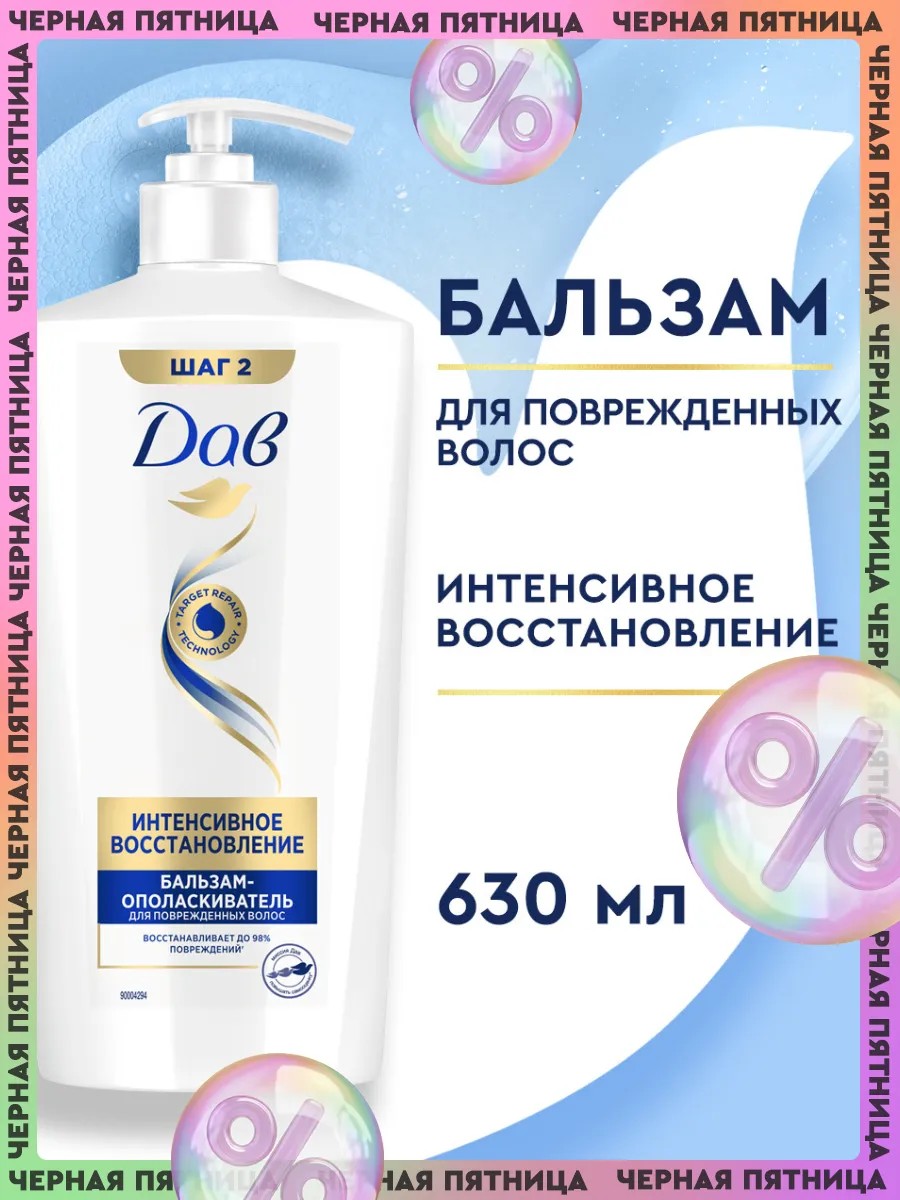 Бальзам для поврежденных волос представлен в объеме 630 мл, которого вам хватит надолго. Флакон оснащен помпой для удобства. Прежде чем наносить бальзам ополаскиватель, помойте голову шампунем Дав Интенсивное восстановление. Для наилучшего эффекта используйте восстанавливающий бальзам Дав каждый раз после мытья волос.