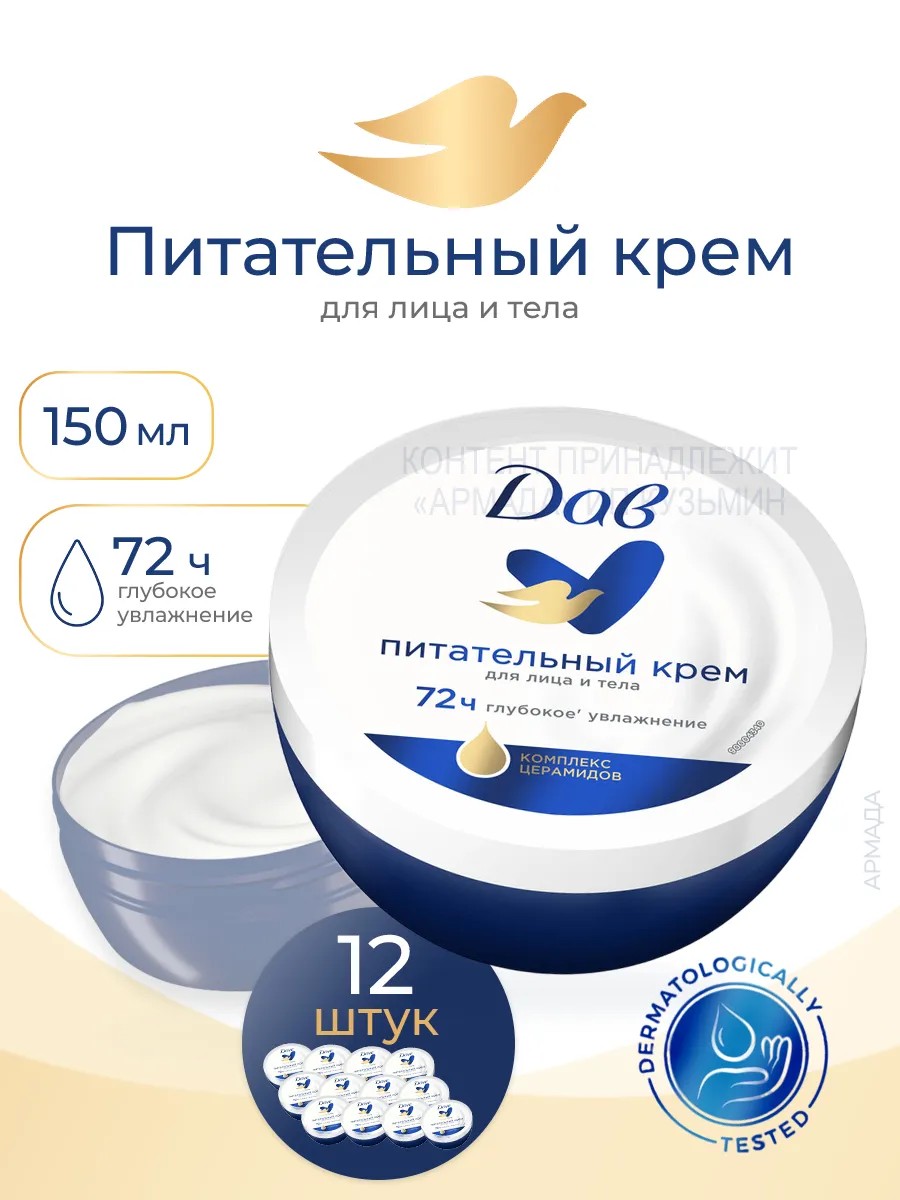 Дав Крем для лица и тела Питательный 150 мл, 12 шт. Питательный крем Дав разработан для универсального применения и подходит для кожи лица и тела. Особенная формула бережно увлажняет и питает кожу, помогая восстановить её естественный водный баланс, а также защитить кожный барьер от обезвоживания в течение 72 часов после применения. Легкая и, вместе с тем, густая текстура крема превосходно впитывается, не оставляя жирных следов и создавая чувство комфорта и свежести. Уникальная' формула, способствующая выработке церамидов — особенных липидов, формирующих защитный барьер кожи, поддерживающих его функции и способствующих удержанию влаги, обеспечивает интенсивное увлажнение длительное время. Нанесите крем легкими массажными движениями на лицо, руки и ноги после очищения кожи — средство моментально впитается, оставляя ощущение гладкости и комфорта на весь день. Крем Dove не вызывает раздражения и подходит для всех типов кожи. Средство дерматологически протестировано, а его эффективность подтверждена клиническими испытаниями в Канаде в 2018 году. А удобная форма и размер баночки большого формата 150 мл позволяют всегда носить её с собой и использовать по мере необходимости.В комплекте 12 штук. Состав: Aqua, Butyrospermum Parkii (Shea) Butter,Caprylic/Capric Triglyceride, Glycerin, Glyceryl Stearate, C12-15 Alkyl Benzoate, Ethylhexyl Stearate, Isopropyl Myristate, Paraffinum Liquidum, Cetearyl Alcohol, Theobroma Cacao (Cocoa) Seed Butter, Dimethicone, Acrylates/C10-30 Alkyl Acrylate Crosspolymer, Allantoin, Caprylyl Glycol, Ceteareth-20, Disodium EDTA, Helianthus Annuus (Sunflower) Seed Oil, Hydroxyacetophenone, Palmitic Acid, PEG-40 Hydrogenated Castor Oil, Phenoxyethanol, Potassium Cetyl Phosphate, Stearic Acid, Triethanolamine, Xanthan Gum, Parfum, Alpha-Isomethyl Ionone, Citronellol, Coumarin, Hexyl Cinnamal, Limonene, Linalool.