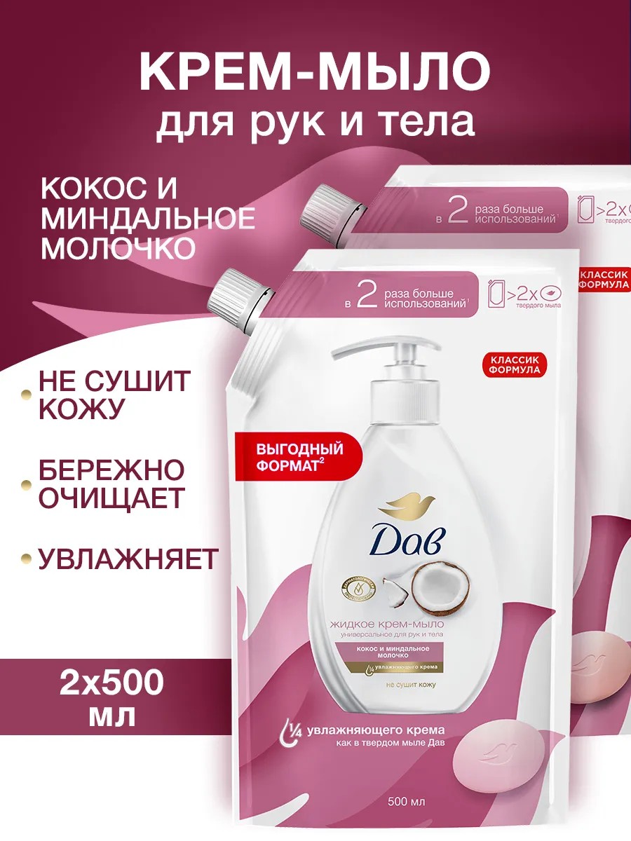 Dove Coconut & Almond Milk Liquid Cream Soap. The set includes two 500 ml doypacks. A quarter of this creamy soap cleanses in seconds and nourishes for 24 hours. Its moisturizing formula ensures gentle and thorough cleansing of impurities, a neutral pH, and a feeling of hydration and softness. Free from parabens and dyes, its formula is 95% biodegradable. Ideal for regular washing, it doesn't leave hands feeling dry or tight. The doypack format is easy to store and use; simply pour it into the dispenser.