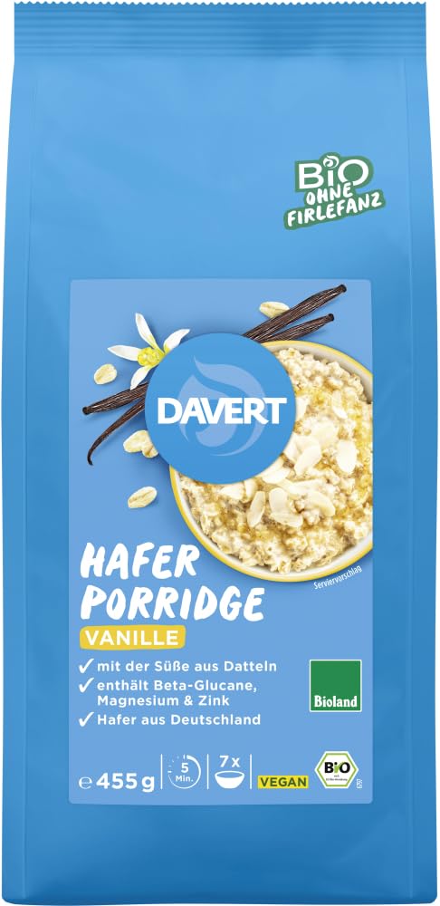 Taste: Storage and usage instructions: Store in a cool, dry place. Finishing touch: With your porridge pack, you can start a pleasant and healthy day for a whole week. For your perfect breakfast, we use particularly delicate whole-grain porridge flakes of organic quality from Bioland-Höfen in Germany. This porridge is rich in minerals and fiber and combines delicious oat flakes, the caramel sweetness of dates, and delicate vanilla for pure porridge enjoyment. Tip: Kids will love it too. Certification en German Organic Label EU Organic Label INGREDIENTS Oat flakes 86 , wheat flour, date granules 4.2 , date juice concentrate, rice flour, vanilla 0.3 , sea salt.