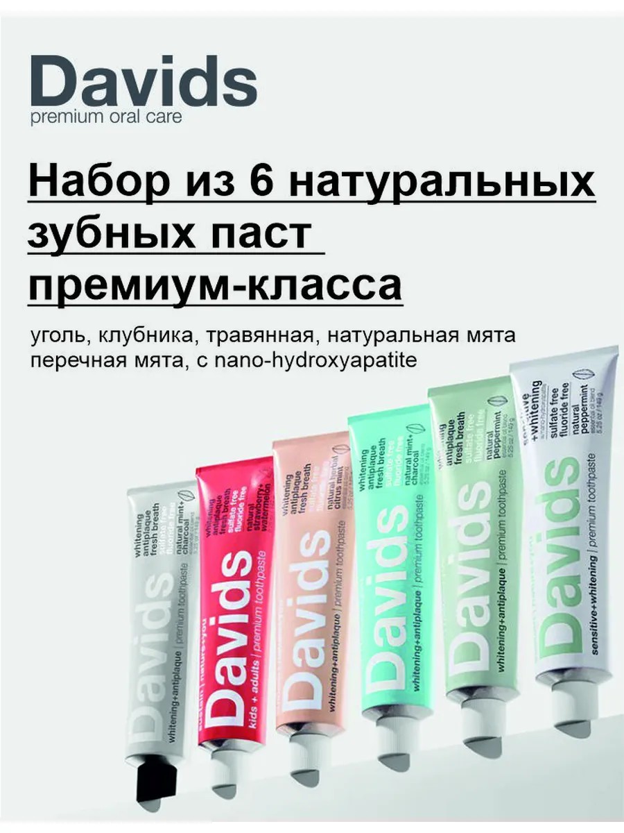 Набор натуральных зубных паст Davids премиум класса — это идеальный выбор для тех, кто заботится о здоровье и красоте своей улыбки. В набор входят 6 паст с восхитительными вкусами: Уголь плюс мята, Арбуз плюс клубника, Травяная цитрусовая мята, Натуральная мята, Перечная мята, Наногидроксиапатит (n-HA) перечная мята . Каждая паста создана из натуральных ингредиентов и обеспечивает комплексный уход за полостью рта, освежает дыхание и бережно отбеливает эмаль. Davids Toothpaste — это забота о вашей улыбке, вдохновленная природой.