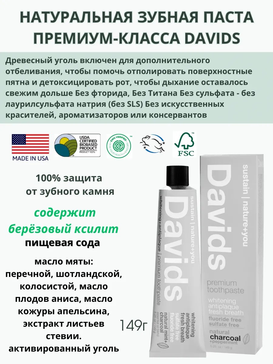 Davids Toothpaste Отбеливающая натуральная зубная паста премиум Davids с углём