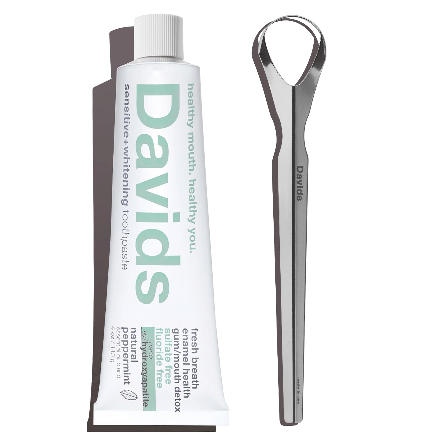 Healthy Mouth – formulated to restore a healthy PH balance and support your mouth's natural oral microbiome. Plaque is the main enemy of teeth and Davids is designed to aggressively stop plaque from forming and reduce existing plaque buildup, while leaving your mouth feeling minty fresh and exceptionally clean. Healthy mouth for a healthy you. Clean Safe Ingredients – Davids uses only premium ingredients derived from plants and the earth, with no animal by-products (vegan). Fluoride Free, Sulfate Free (no SLS), EWG VERIFIED. No Artificial Flavors, Colors, or Preservatives. Birch xylitol used to improve oral health. Tongue Scraper - designed to quickly remove debris from your tongue for a healthier cleaner mouth. Improves oral hygiene, freshens breath increases sense of taste. Safe Gentle Whitening – micro polishing agents gently remove surface stains to safely whiten without causing the sensitivity normally found with peroxide or other bleaching agents. RDA (abrasive rating) of 101 to effectively remove plaque and surface stains while being enamel safe for daily brushing. Safe range per ADA (American Dental Association). Features Hydroxi, our proprietary formulation of Nano Hydroxyapatite (n-HA) - the same ingredient that naturally makes up 97 of your teeth material, and carefully selected natural ingredients. We eliminated the fluoride and replaced it with this biocompatible ingredient to remineralize your enamel, reduce teeth sensitivity and naturally whiten.
