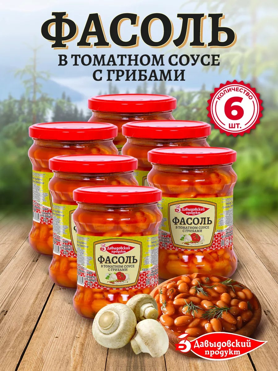 DAVYDOVSKY PRODUCT beans are an excellent source of vegetable protein, vitamins, and minerals. The dishes are light yet filling. This product is ideal for fasting and vegetarian diets, as well as for sports and healthy eating. It's an excellent option for those who adhere to a healthy lifestyle. This snack is made from white beans and fresh mushrooms in a tomato sauce according to a recipe developed by the plant's technologist. With this product, you can prepare a delicious lunch or dinner in minutes. Beans go perfectly with boiled potatoes, pasta, rice, buckwheat, meat, and poultry. We also offer a variety of delicious soups, canned goods, nectars, and many other products. Enjoy your meal! You can find us by searching for: canned beans, beans in a jar, canned beans.