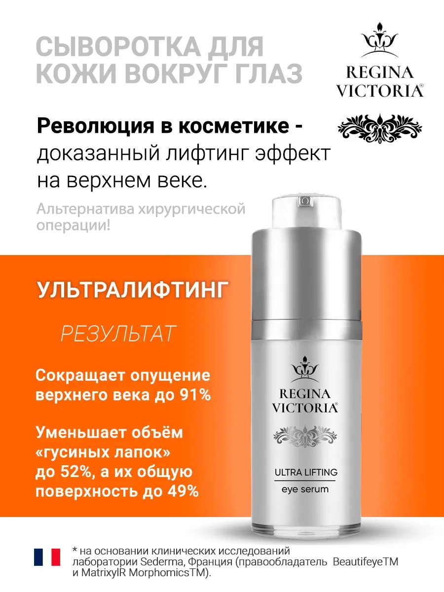 Сыворотка Регина Виктория объема 15 мл от Фабрики Рассвет - революционный продукт на основе экстракта персидского шёлкового дерева (BeatifeyeTM) и пептидного комплекса MatrixylR MorphomicsTM является альтернативой хирургической блефаропластике.
