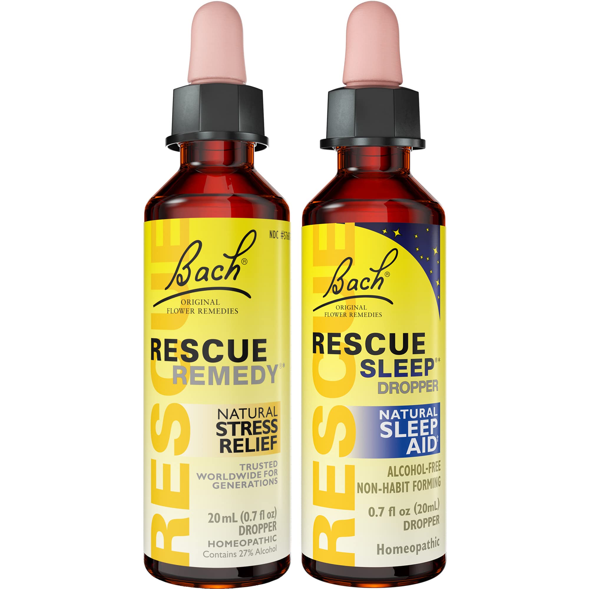 "A day and night bundle for holistic wellness routine providing around-the-clock daytime stress relief and nighttime sleep support with Bach Rescue Remedy Dropper and Bach Rescue Sleep Dropper. Bach Rescue Remedy Dropper features the Bach 5-flower essence blend to provide gentle relief from everyday stress. A daily essential for those moments when you are juggling the stresses of work, school, family, and personal life. Pairs perfectly with Bach Rescue Sleep Dropper for relief from occasional sleeplessness caused by stress and repetitive thoughts. Combines the Bach 5-flower essence blend used in Rescue Remedy plus Bach White Chestnut, to calm your restless mind and put sleeplessness to bed. For everyday stress relief: Adults, put 4 drops on to your tongue or in a beverage as often as needed. Contains approximately 190 doses. For a natural night's sleep: Adults and children ages 2 , take 4 drops directly on the tongue or in a beverage . Additional drops may be taken during the night as needed. Contains approximately 130 doses."