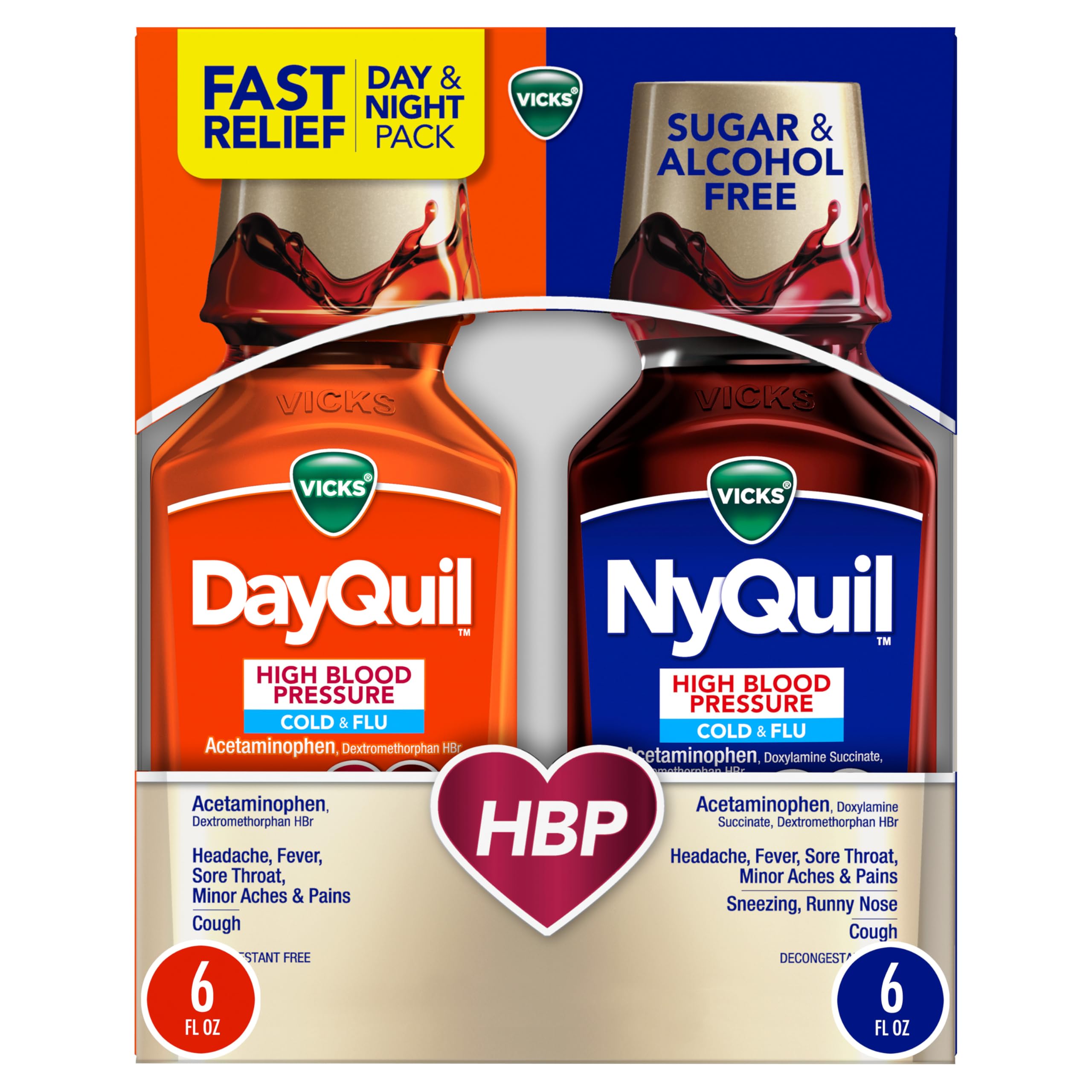 From the world's 1 selling OTC cough and cold brand, Vicks DayQuil and NyQuil High Blood Pressure liquid medicines are over-the-counter medications specially formulated for people with high blood pressure. High blood pressure means some medicines are off limits. Not these. With this DayQuil and NyQuil Liquid combo pack, you'll have the cold and flu multi-symptom relief you need on hand, day or night. If you have High Blood Pressure, DayQuil and NyQuil High Blood Pressure medicine provides fast, powerful relief for your worst cold flu symptoms. They are sugar free and alcohol free. DayQuil and NyQuil High Blood Pressure are also decongestant free, unlike some ordinary cold medicines. When you have a cold and need to get a good night's sleep, NyQuil High Blood Pressure nighttime medicine will temporarily relieve headaches, fever, sore throat, minor aches and pains, sneezing, runny nose, and cough. For powerful, non-drowsy daytime relief so you can power through your day, try Vicks DayQuil High Blood Pressure Cold Flu - it temporarily relieves headache, fever, minor aches and pains, sore throat, and cough. Vicks has been trusted for over 125 years to relieve your cold and flu symptoms. When you need fast, powerful cold and flu relief, turn to Vicks DayQuil and Nyquil.WORLD'S 1 SELLING OTC COUGH AND COLD BRAND. Vicks has been trusted for over 125 years to relieve your worst cold flu symptoms. POWER THROUGH YOUR WORST COLD FLU SYMPTOMS. Life doesn't stop when you have a cold. DayQuil and NyQuil relieve bothersome symptoms, such as cough and fever, day or night. EFFECTIVE COLD FLU SYMPTOM RELIEF. DayQuil and NyQuil Cold Flu medicine temporarily relieve common cold flu symptoms. Just one dose starts working fast to provide effective cold flu relief. FAST, POWERFUL MULTI-SYMPTOM RELIEF. Use non-drowsy DayQuil for daytime relief and at night try NyQuil for fast relief so you can rest. SPECIALLY FORMULATED COLD FLU RELIEF FOR PEOPLE WITH HIGH BLOOD PRESSURE. High blood pressure means some medicines are off limits. Not these! Specially formulated to be decongestant, sugar, and alcohol free.