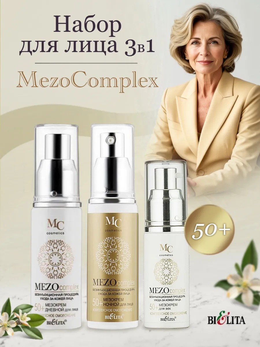 Face cream set for ages 50+. 3-in-1 cream set: Comprehensive rejuvenation 50+ MEZOcomplex. This series is suitable for all skin types aged 50+. The day cream provides a comprehensive effect and effectively smoothes wrinkles in the "beauty triangle." Day mezocream provides a lifting effect and deeply moisturizes.