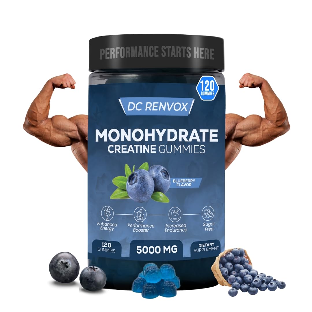 DC Renvox Creatine Monohydrate Gummies 5000mg – Vegan Strength Energy Support Looking for an easy and tasty way to boost your workouts? DC Renvox Creatine Gummies are designed to help men and women improve muscle strength, energy, and recovery. Each serving delivers 5000mg of high-quality creatine monohydrate along with essential nutrients to maximize performance. Key Benefits: Supports Muscle Strength Growth: 5000mg creatine monohydrate per serving. ? Boosts Energy Focus: Includes L-Taurine, Betaine, and Alpha GPC. Vegan Clean Formula: Non-GMO, gluten-free, and free from artificial colors. Vitamin B12 for Energy: Supports daily energy metabolism and overall vitality. Delicious Blueberry Flavor: Easy-to-take gummies, 120 per bottle. How to Use: Take 4 gummies daily, preferably around your workout, or as recommended by your healthcare professional. Why Choose DC Renvox? Our gummies are convenient, vegan, and science-backed. No powders, no messy mixing — just a simple, effective gummy that helps you stay strong and energized every day. Ingredients: Creatine Monohydrate, L-Taurine, Betaine, Alpha GPC, Vitamin B12, Natural Blueberry Flavor, Organic Tapioca Syrup, Pectin, Citric Acid. Package Details: - 120 gummies per bottle - 5000mg creatine per serving - Vegan, gluten-free, non-GMO? Energy Performance Support Formula Made with L-Taurine, Betaine, and Alpha GPC to complement creatine and support focus and training intensity during workouts. Delicious Blueberry Gummies Easy-to-take alternative to powders and capsules 120 gummies per bottle for convenient daily use with no mixing required. ✓ 120 Blueberry-flavored gummies per bottle. ✓ Includes L-Taurine, Betaine, Alpha GPC B12 for energy support. ✓ Vegan, gluten-free, and non-GMO. ✓ 5000mg Creatine per serving for muscle strength.