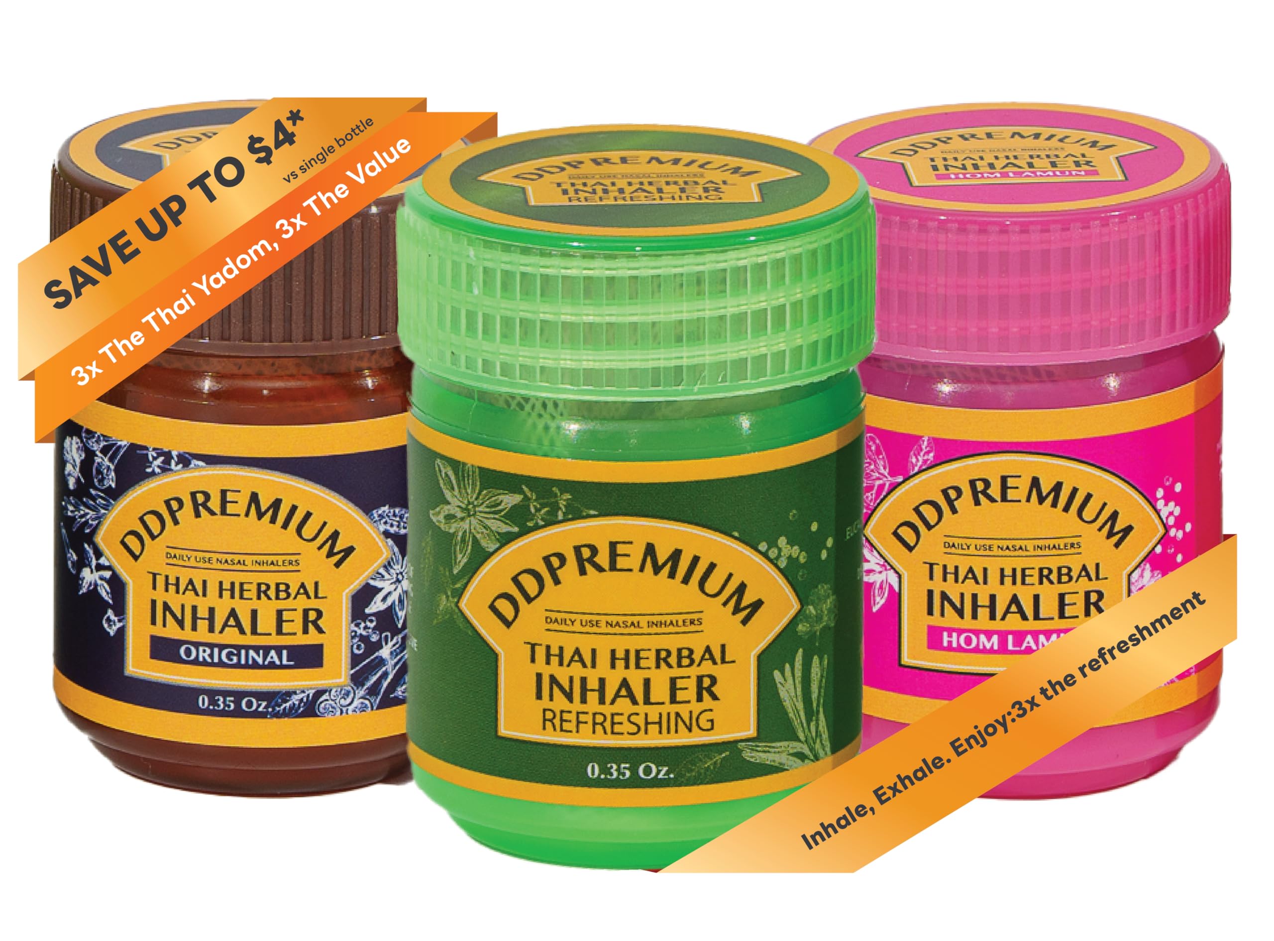 DDPREMIUM Herbal Inhaler with Menthol & Essential Oil - Yadom Refreshing HOM Lamun Original Formula 3 Pack