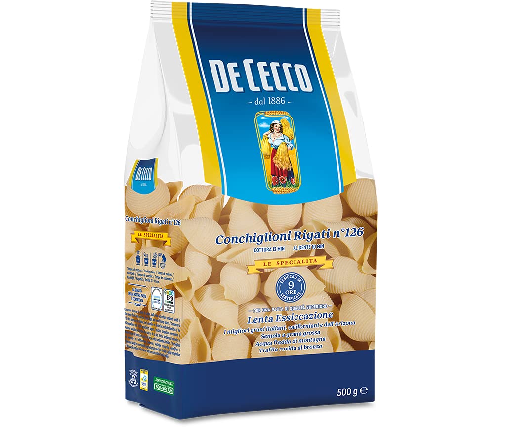 Premium Durum Wheat Semolina Pasta. Over a century ago, in Abruzzo, began the story of a company that, like all great companies, relied on an army of passionate men. This is the story of the De Cecco Brothers' Mill and Pasta Factory, which for over 130 years has produced pasta synonymous with quality and Italian pleasure worldwide. This story dates back to the vicissitudes of pre-unification Italy, when in Farah San Martino, a small town at the foot of Mount Magellan, Don Nicola De Cecco produced "the best flour in the whole countryside" in his stone mill. As tradition dictated for generations, "Zi Nicola" passed on all his art and passion to his son, Filippo Giovanni, who thus began a new chapter in the De Cecco family history by starting pasta production. This is how the De Cecco Brothers' Mill and Pasta Factory was born. The year was 1886. "The best flour in the whole countryside" began the long journey that would lead it to become superior quality pasta. Don Filippo Giovanni De Cecco, combining his long-standing artisanal experience with his engineering intuition, developed a new low-temperature dryer, thus breaking the constraint that had made production dependent on weather conditions. Until then, pasta had always been sun-dried, the only way to guarantee the product's exceptional quality and shelf life. It was thanks to this insightful intuition that the De Cecco factory began to expand into new markets, initiating the company's internationalization process. In 1908, the young Abruzzo peasant woman with her sheaves of wheat became the company's symbol. After the Second World War, a period of growth began to emerge, bringing De Cecco to its current size: the factory, completely razed by German bombing, was rebuilt and resumed production, incregly geared towards an international perspective. In the 1950s, to support this renewed production, the Pescara Pasta Factory was inaugurated to handle the increased production demands of those years. 1980 marked another inauguration: a new, modern production unit with significantly expanded capacity was established in Farah San Martino. In 1985, new market demands emerged, forcing the Company to prepare for a fundamental transition and establish its own sales network. Another important milestone was the creation of the "Huilière Company" in 1986, marking the first step towards a substantial differentiation of the product range, which would be further expanded in 1993. The 1990s were a period of massive investment: the new Farah San Martino mill was built, boasting a processing capacity equivalent to 11,000 quintals of wheat per day. In 1997, the Ortolan factory was founded, a prime example of modernity and cutting-edge technology serving the long-standing tradition of pasta making. Over time, much has changed: today, the De Cecco brand is synonymous with exceptional quality in the semolina pasta sector, and De Cecco is a group with a turnover exceeding €220 million, a third of which comes from exports. However, the commitment to passing on, safeguarding, and consolidating the Founder's production principles remains unchanged: high-quality wheat, fresh semolina straight from its own mill, bronze dies, slow drying at low temperatures, and continuous quality control. Then as now, everything stems from the symbiosis between strong passions and the relentless pursuit of perfection, which is evident in every "signed" De Cecco gesture, starting with the pasta. INGREDIENTS Premium quality organic wholemeal durum wheat semolina pasta INSTRUCTIONS After cooking. For perfect cooking: use 6 liters of water for every 500g of pasta. Add salt and, once the water has returned to a boil, add the pasta. Stir occasionally. When cooked, drain and season to taste. SAFETY WARNING Do not expose to sunlight See moreDe Cecco Pâtes Conchiglioni Rigati 500 g - Lot de 6DESCRIPTION DU PRODUIT DESCRIPTION DU PRODUIT Pâtes alimentaire de semoule de blé dur de qualité supérieure Il y a plus de cent ans, dans les Abruzzes, commençait l'histoire d'une entreprise qui, comme toutes les grandes entreprises, comptait sur une armée d'hommes remplis de passion. C'est l'histoire du Moulin et de la Fabrique de Pâtes Alimentaires des Frères De Cecco qui, depuis plus 130 ans, produit des pâtes qui sont synonymes de qualité et de plaisir à l'italienne dans le monde entier. Cette histoire remonte aux vicissitudes de l'Italie avant l'unification, quand à Farah San Martino, un petit bourg au pied de la Magellan, Don Nicola De Cecco produisait dans son moulin en pierre "la meilleure farine de toute la campagne". Comme le dictait la tradition déjà depuis plusieurs générations, "Zi Nicola" transmit tout son art et sa passion au fils Filippo Giovanni qui entama ainsi un nouveau chapitre de l'histoire de la famille De Cecco, en commençant la production de pâtes. Voilà comment sont nés le Moulin et la Fabrique de Pâtes Alimentaires des Frères De Cecco. Nous sommes en 1886. "La meilleure farine de toute la campagne" commence le long voyage qui la conduira à devenir des pâtes de qualité supérieure. Don Filippo Giovanni De Cecco, alliant l'ancienne expérience artisanale et ses intuitions d'ingénierie, mit au point un nouveau modèle de sécheur à basse température, brisant ainsi la limite qui subordonnait la production aux conditions météorologiques. Jusqu'alors, les pâtes avaient toujours été séchées au soleil, le seul moyen pour garantir l'extrême qualité et la capacité de conservation du produit. C'est grâce à cette perspicace intuition que la Fabrique De Cecco commença à s'ouvrir vers de nouveaux marchés, donnant le départ au processus d'internationalisation de l'entreprise. En 1908, la jeune paysanne abruzzaise avec ses gerbes de blé devint le symbole de l'Entreprise. C'est après la Deuxième Guerre Mondiale qu'une phase de croissance commença à poindre le bout de son nez et amena De Cecco à ses dimensions actuelles: l'usine, complètement 