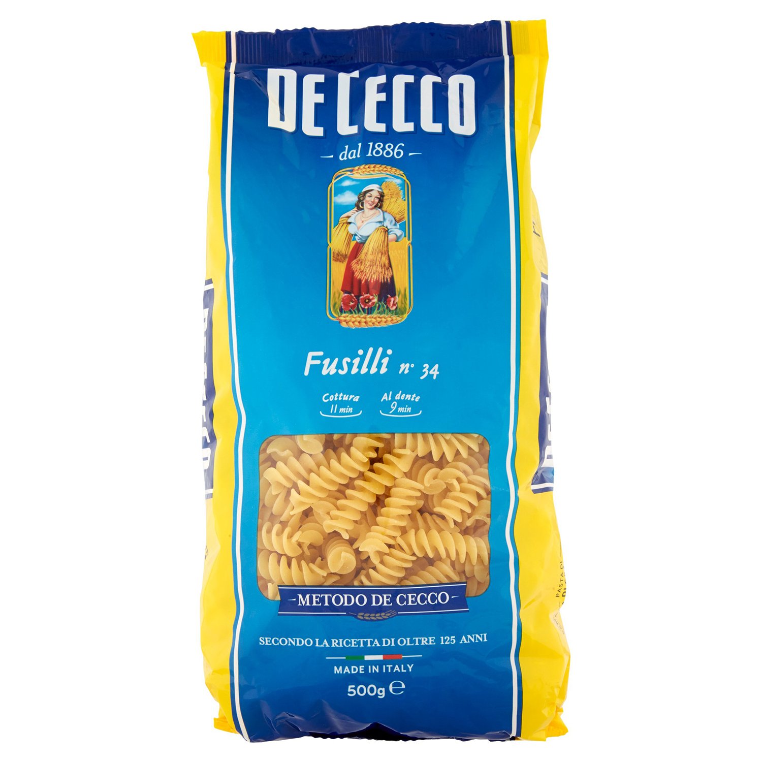 De Cecco fusilli pasta gently grinds the heart of each grain, blends it with cold spring water, and then slowly kneads the dough. This results in pasta with De Cecco's exceptional aroma, flavor, and consistency. The pasta cooks easily to perfection, has an excellent firm texture, and a delicious "fresh" pasta taste. It has a slightly rougher surface, which helps sauce cling to it. It is a good source of protein, thiamine, folic acid, iron, riboflavin, and niacin. Non-GMO, trans fat-free, saturated fat-free, and no added sugar. It is certified kosher. INGREDIENTS Durum Wheat Semolina COOKING INSTRUCTIONS Cook in boiling water for 11 minutes, stirring occasionally. See moreDe Cecco Fusilli, 500 gDESCRIPTION DU PRODUIT DESCRIPTION DU PRODUIT Les pâtes fusilli De Cecco broient doucement le cœur de chaque grain, les mélangez avec de l'eau froide de source puis pétrissez la pâte lentement. Il en résulte des pâtes avec l'arôme, la saveur et la consistance exceptionnels De Cecco. Les pâtes cuisent facilement à la perfection, ont une excellente texture ferme et un délicieux goût de pâtes « fraîches ». Il a une surface plus rugueuse, ce qui aide la sauce à y coller. C'est une bonne source de protéines, de thiamine, d'acide folique, de fer, de riboflavine et de niacine. Sans OGM, sans graisse trans, sans graisse saturée, sans sucre ajouté. Il est certifié par casher INGRÉDIENTS Durum Wheat Semoule MODE D'EMPLOI Cuire dans l'eau bouillante pendant 11 minutes en remuant de temps en temps. Voir plus