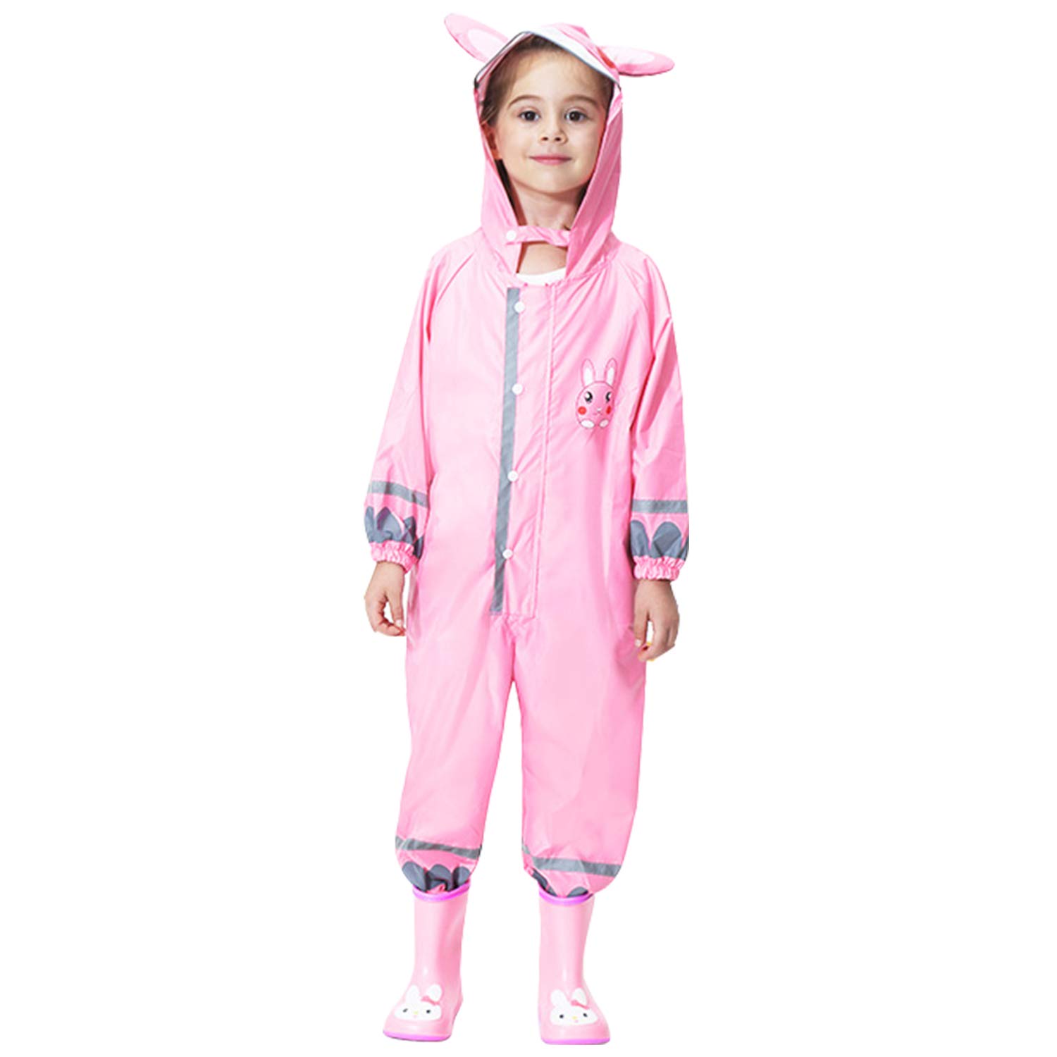 De feuilles Kids Button Rain Suit All-in-one Waterproof Puddle Suits Hooded Raincoat Jumpsuit 4-6 Years Pink Rabbit