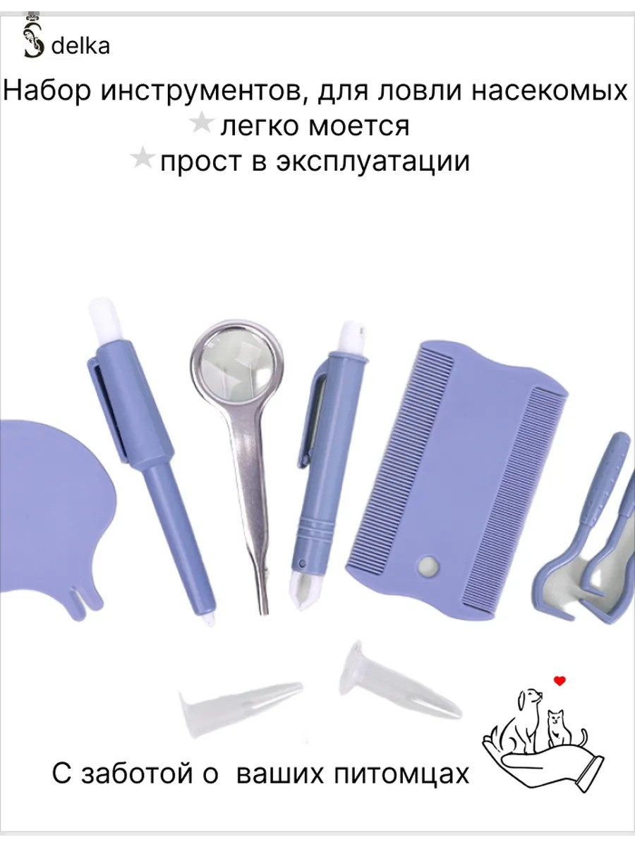 Набор для удаления клещей, паразитов,блох, расческа для удаления блох. Выкручиватель клещей позволит выкрутить клеща с легкостью и безболезненно, не оставляя головку. Первым делом необходимо подобрать размер крючка, для большого клеща большой крючок, для маленького маленький крючок. Далее необходимо подцепить клеща в прорезь крючка и повернуть его на 2-3 оборота.изготовлен из прочного и безопасного пластика удобен в применении и легко дезинфицируется, удобен при перевозке и хранении, благодаря универсальному размеру может использоваться как для людей, так и для животных. Универсален: подходит для извлечения клещей любого размера и независимо от места укуса.Увеличительное стекло поможет выявить паразита на коже вашего питомца, а контейнер позволит упаковать насекомое и обезопасить себя. Расческа входящая в набор поспособствует удалению блох не повреждая кожу животного.Эффективный набор от клещей для собак и кошек позволит своевременно извлечь присосавшегося и снизить вероятность заражения инфекциями. После каждого применения устройство следует промыть в теплом мыльном растворе, затем прополоскать в проточной воде и обработать дезинфицирующим средством.Набор для удаления клещей прослужит вам долго.