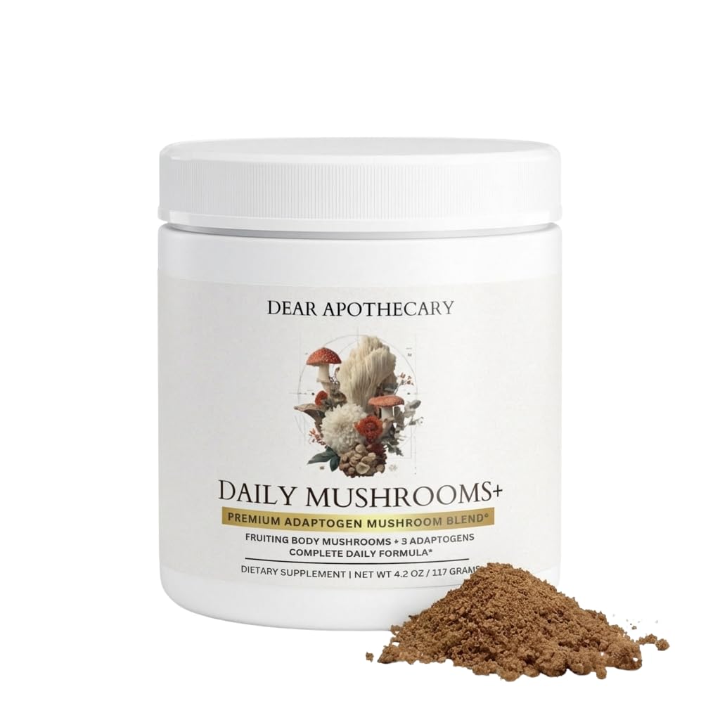 Dear Apothecary Daily Mushrooms+ Organic Mushroom Powder | 7 Fruiting Body Extracts + Adaptogens | Lion's Mane Reishi Cordyceps Chaga | 60 Servings