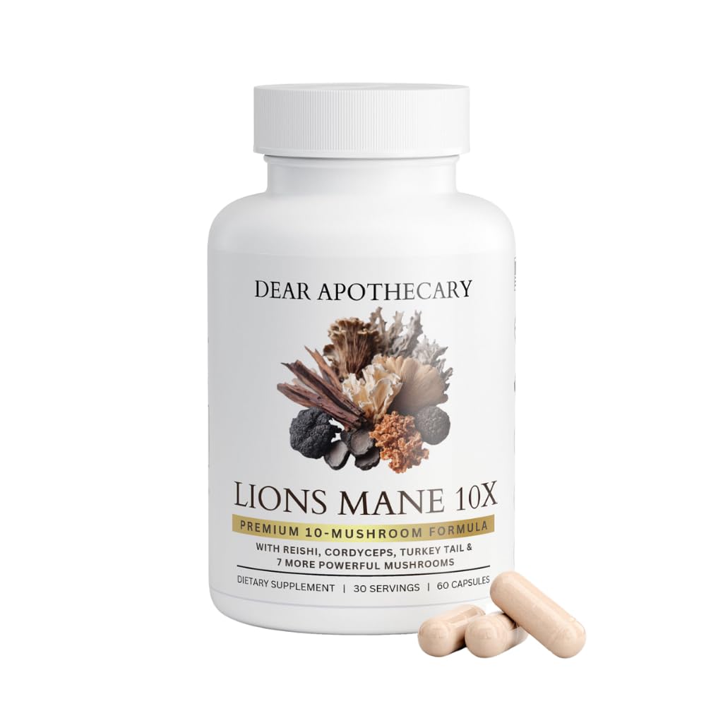 Dear Apothecary Lions Mane 10x Mushroom Supplement - Reishi Cordyceps Chaga Turkey Tail - Nootropic Brain Health Immune Support Energy Focus - Functional Mushroom Blend - Vegan Non-GMO - 60 Capsules