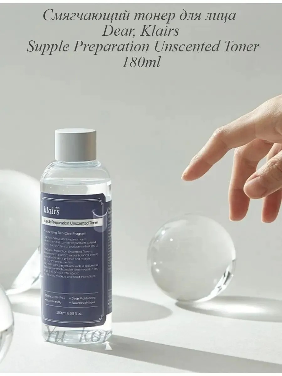 Смягчающий тонер Klairs Supple Preparation Unscented Toner восстанавливает оптимальный рН-баланс после очищения кожи и повышает эффективность всех последующих шагов ухода. Средство интенсивно увлажняет и питает кожу, устраняет шелушения и сухость не провоцирует раздражений и регулирует выработку кожного себума.