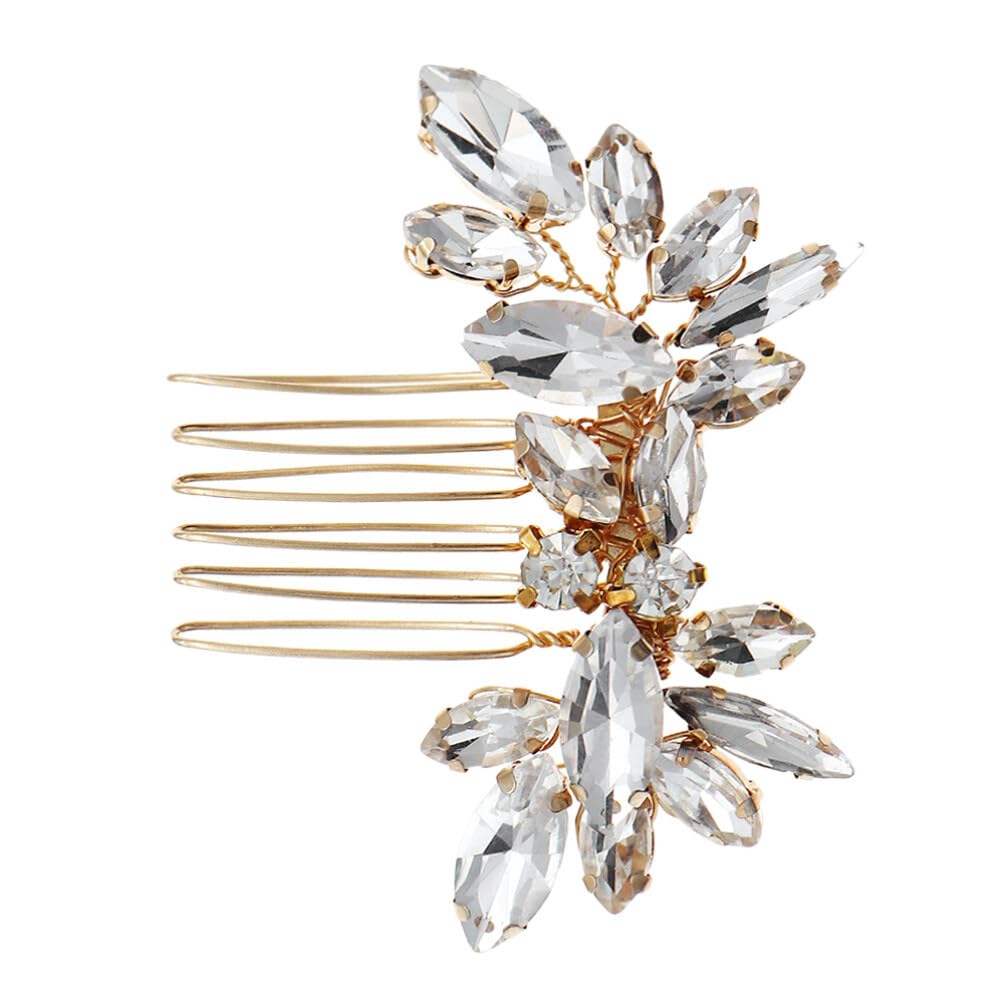 Description The hair comb is lightweight and comfortable to wear, ensuring that it doesn't burden the hairstyle. With its versatile design, it can be styled in various ways to complement different wedding dress styles. The bride hair comb is a match for any style of wedding. Features -Color:Golden -Material:Rhinestone -Size:6.00X5.00X1.50cm Package Including 1 x hair comb