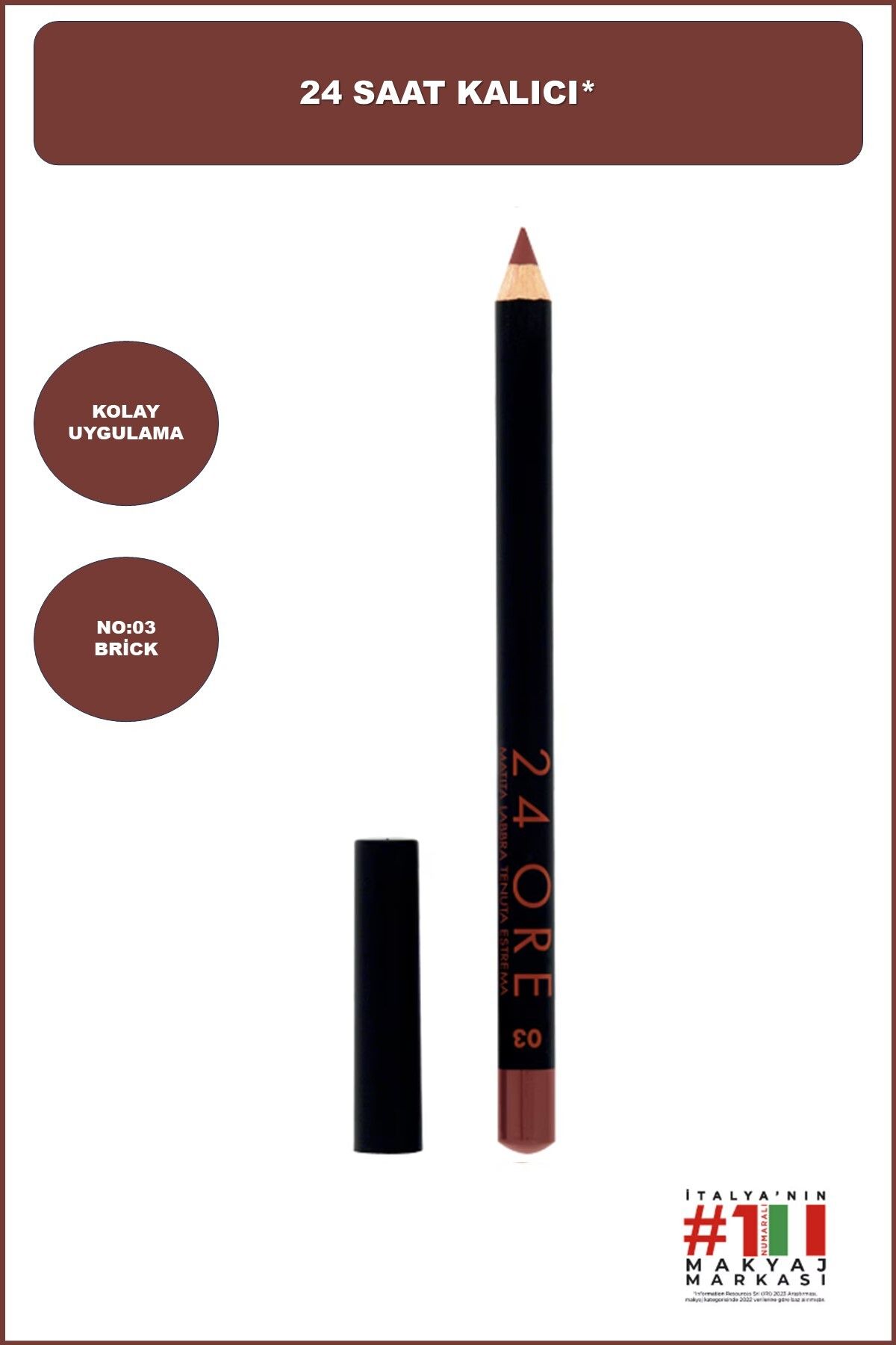 Dudaklarda yapilacak degisimin en önemli adimini olusturan Deborah Milano 24 Ore Dudak Kalemi No. 3 Brick, kusursuz görünümün temelidir. Dudaklariniza sürdügünüz rujun daha kalici olmasini saglayan kalem, dolgun görünümün saglanmasinda önceliklidir. Rujun dudaklarin kenarina bulasmasini engelleyen kalem uygun tonlarda seçilir. Kalin ve dolgun dudak görünümü için çerçevenin disariya dogru tasmasi gerekir.