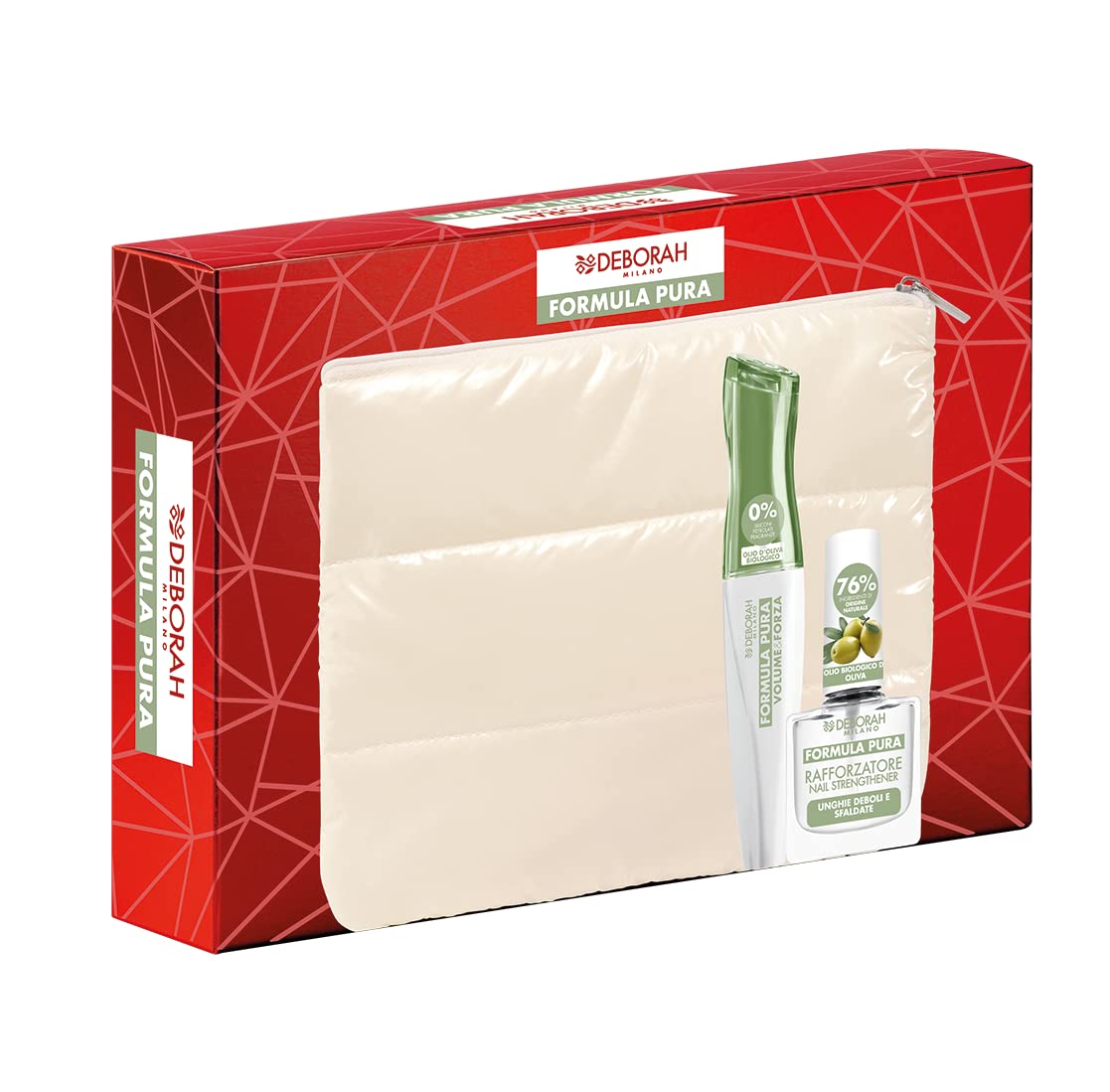 White padded pouch. Contains 1 Formula Pure Volume Strength mascara and 1 nail treatment and strengthening polish. Formula Pure N.01 gift pouch. Discover Deborah Milano Formula kits and gift sets to impress your loved ones on special occasions.
